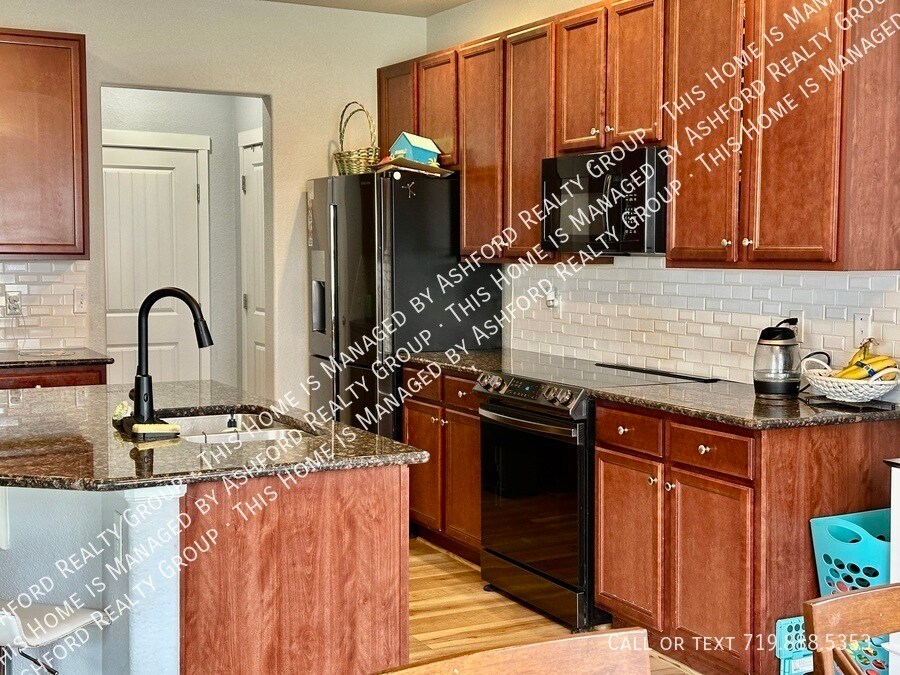 Beautiful 2story home with 5 beds, an office and a loft. Vaulted entry with wood floors throughout the main, office with french doors. The Great Room opens to a large gourmet kitchen with gas stove, granite countertops, walk in pantry, butler's pantry, 42 inch cabinets with brushed knickel hardware and a large island. The upper level has a great loft area for the kids or another office area, and four big bedrooms. The primary bedroom has an adjoining 5-piece bath and huge walk-in closet. The basement offers a large family room, an extra bedroom and a full bath. Enjoy the covered patio in your fenced backyard. 3 car garage! Close to schools, parks, shopping, entertainment and quick hop onto the Powers corridor to get to any base! Disposal Dog Allowed Dogs Only Fence Garage Pets Allowed Range