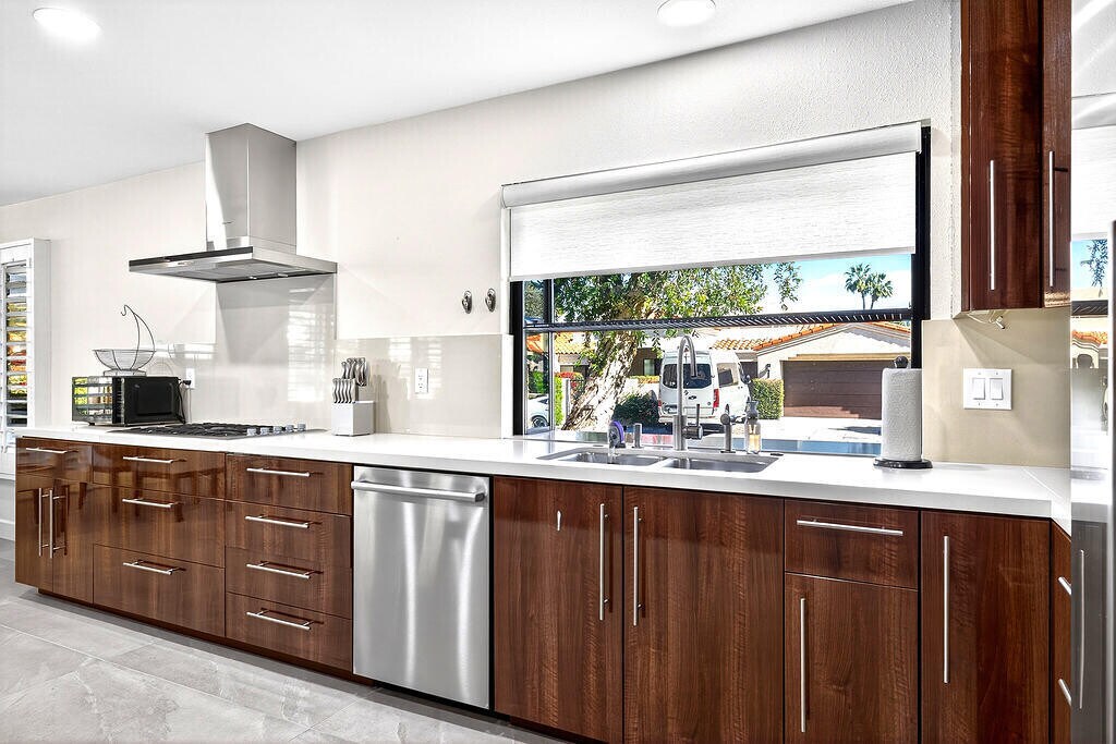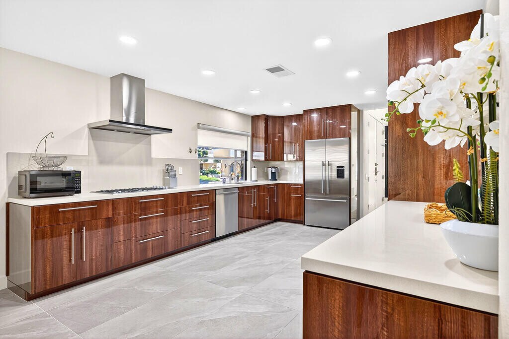 Contemporary 3 bedroom + den and 3.5 bathrooms. Fabulous mountain view. Located on a corner lot in Sandpiper Cove at prestigious Indian Wells Country Club. Quartz countertops throughout,stainless appliances,water purification system,ceiling fans,hardwood floors in bedrooms,porcelain tiled floors in kitchen and bathrooms. Association pool and tennis court nearby. Modern gourmet kitchen with glossy walnut cabinets,quartz countertops and stainless appliances. Gas cooktop,wine cooler,and large kitchen window with mountain views. Dining area adjacent kitchen and great room. The great room has gorgeous high ceilings and gas fireplace with glass crystals and quartz hearth. Primary bedroom has views and spacious bathroom with dual sinks,undercounter lighting,custom mirrors which function as cabinets,two walk-in closets,and large custom shower. Both guest bedrooms open to private spacious courtyard. One guest bedroom has jetted tub and shower,dual sinks and walk-in closet. Powder room has an onyx waterfall countertop. 3-bay garage. Owner includes Internet + concierge trash service. Owner includes electricity,gas,water up to $200.00 per month. 24-hour manned gate & roving patrol. Indian Wells CC is a member of the INVITED family of clubs (formerly ClubCorp). No memberships are included. MLS # 219144491
