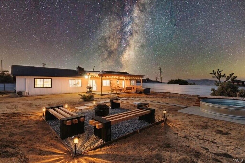 Welcome to 7795 Sunset a beautifully updated 4 bedroom, 2 bathroom home in one of Joshua Tree’s most desirable neighborhoods, just minutes from the National Park. This 1,796 square foot home offers an open concept layout with a modern kitchen featuring quartz countertops and a breakfast bar. Each bedroom is equipped with its own mini-split A/C unit for personalized comfort. The garage has been converted into a versatile game room. Fully fenced backyard complete with an above ground pool, hot tub, fire pit, and views of the mountains and desert landscape. A spacious laundry room.