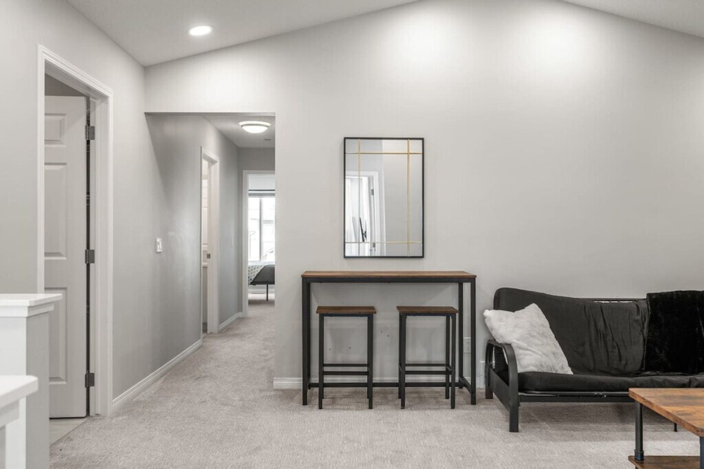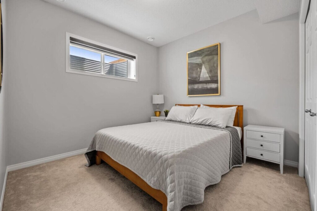 Welcome to this refined and spacious home in Calgary, designed for both comfort and convenience, perfect for large groups, families, or corporate stays. This large home accommodates up to 16 people and features central heating and AC, three fully stocked kitchens, three living rooms, and five bedrooms, including one king-size and four queen-size beds, all equipped with TVs. Enjoy the convenience of free parking and a garage, along with high-speed Wi-Fi throughout the property. Feel at home with three inviting living rooms, each equipped with comfortable sofas, smart TVs with Netflix, and access to a patio with furniture, a backyard, and a BBQ grill. The kitchens boast stainless steel and custom appliances, including three 4-burner stoves, ovens, microwaves, refrigerators, freezers, and dishwashers. Enjoy complimentary tea, water, coffee, and essentials like paper towels and Keurig pods. The dining areas offer ample seating, perfect for gatherings. This property includes free parking with a two-car garage and offers a free National Park Pass for entry to Banff, Yoho, and other national parks. Additional replenishments of essential supplies during your stay can be provided at an extra cost. Conveniently located, this home is just 5 minutes from McDonald's, Stoney Trail, and No Frills, and 10 minutes from Costco, T&T, and H-Mart. The Calgary International Airport is a 12-minute drive away, while Nose Hill Park, Downtown Calgary, and the Calgary Zoo are all within 20 minutes. Enjoy quick access to major highways, making road trips to Banff, Kananaskis, and Canmore a breeze. The property is professionally managed, ensuring top-tier service with 24/7 guest support and communication. Self check-in and check-out are available, and detailed instructions are provided for a seamless stay. A $250 CAD fine will be charged if smoking is detected, and quiet hours are from 10 pm to 7 am. No parties, excessive drinking, or loud music are allowed, and a strict complaint policy is in place. Unauthorized late check-out will result in additional fees. The home features an office and den area, equipped with high-speed internet, making it remote work-friendly. A laptop computer is not included.
