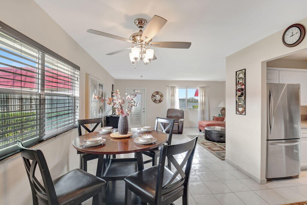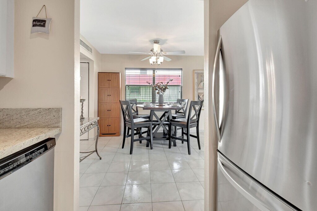 A 55+ Charming 1 bedroom, 1.5 bath home has a updated kitchen and both bathrooms. Title throughout the home. Impact windows on the patio with an A/C to relax. Cool furniture and artwork in the living and dining rooms give a modern vibe. Kitchen has SS appliances and granite countertops and tons of cabinets. Lake views from the living room and grass area to walk to the lake. Oversized primary bedroom with on-suite bathroom with walk in shower. Wall to wall closets with the washer and dryer conveniently located inside. Kings Point in Delray Beach is a short distance to downtown Delray, shopping and the beach. This 55+ gated community offers an array of amenities to peak everyone's interest. Check out the clubhouse after you check out this adorable villa.
