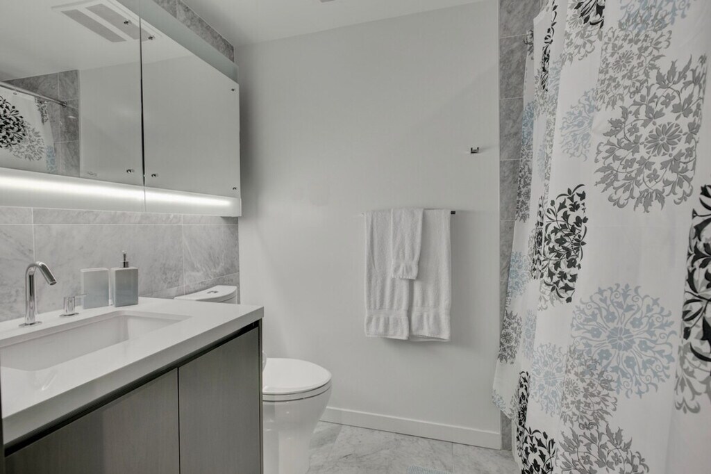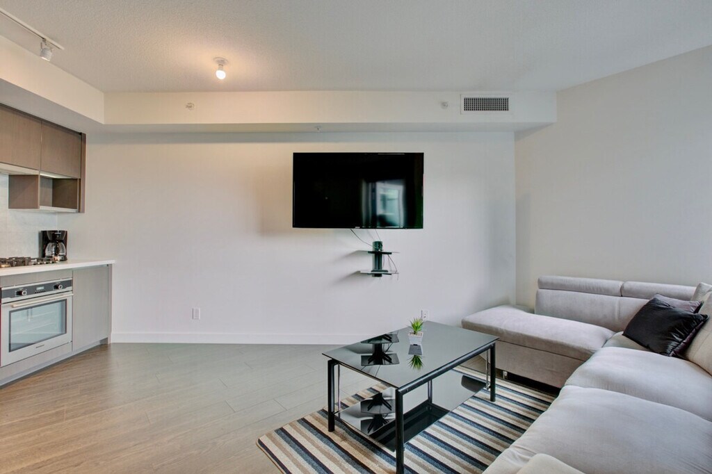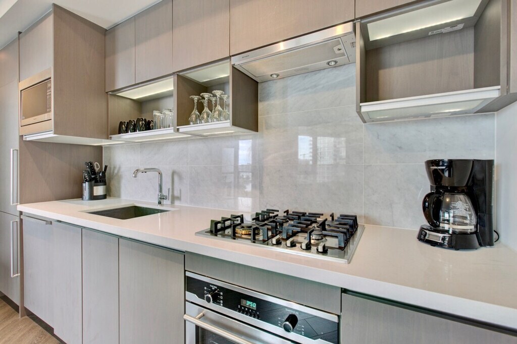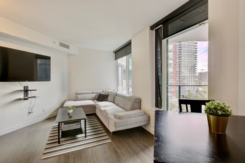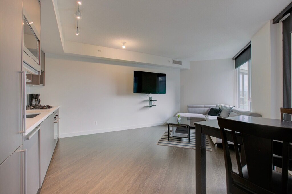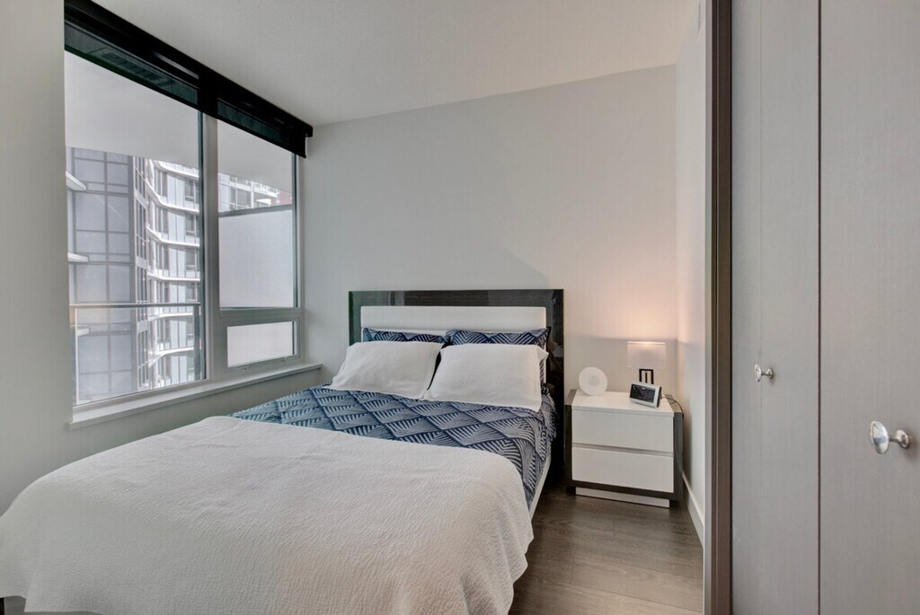 The advertised rate of C$4,036/month is the lowest available price, based on a 30 day(s) stay with a move-in date of October 1, 2026. Rates vary depending on the duration of stay, season, and other parameters. For exact pricing and additional pricing components, please visit our website and enter your desired move-in and move-out dates. The rate is applicable when billed upfront; it can be higher if billed in multiple payments. Feel at home in this furnished 1-bedroom condo in Yaletown Vancouver at One Pacific, spread out over 540 square feet and filled with natural sunlight. The open-concept space has a nice flow, complemented by hardwood floors and eye-catching water views. The den is finished with gorgeous hardwood floors and a modern sliding door. The space-saving wall kitchen is equipped with hidden wood appliances, a deep sink with a goose faucet, a fabulous marble backsplash, and lots of overhead cabinet space. Relax on the deep upholstered grey couch while watching a program on the flat screen TV. The living area is decorated with a shaggy grey area rug, a contemporary glass top coffee table, and a zen Buda painting. Enjoy the sun through the large windows or pull down the dark blinds for optimal privacy. The living room has direct access to the covered balcony, completed with a glass table and two wicker chairs. The balcony reveals those killer water views. The master bedroom has a queen-sized bed with a bold green upholstered headboard. The high-end bathroom is finished with a stunning wood vanity, complemented by a marble backsplash and a well-lit mirror. Residents of One Pacific can enjoy access to a fitness centre, pool, hot tub, sauna, steam room, and theatre. Your rent includes one parking spot, cable, and water. Pets may be considered. Located in coveted Yaletown, you will have a wide range of restaurants, bars, and attractions to choose from. Dine on fresh seafood at Blue Water Cafe, grab a cocktail at the inconspicuous Hello Goodbye, or catch a concert at BC Place Stadium. A one-time move out cleaning fee of $175 applies. [SI]
