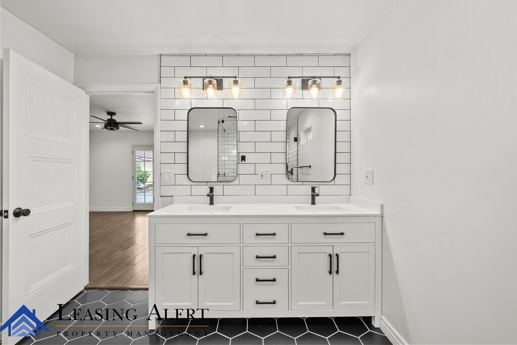 Welcome to 7800 Lindley Ave, a beautifully updated 4-bedroom, 3-bath home with a detached bonus room perfect for a home office, gym, or additional storage, plus a 2-car garage. This completely remodeled property features newer windows, a modern kitchen with stunning granite countertops, elegantly redone bathrooms, newer flooring throughout, upgraded light fixtures, central air and heat, and an updated electrical panel for added peace of mind. The spacious primary suite serves as a private retreat, offering abundant natural light, direct access to the backyard through French doors, and a beautifully renovated en-suite bathroom featuring dual vanities, recessed lighting, a luxurious rain shower, and designer finishes. Outside, the fully fenced property is both functional and inviting, featuring a newer gate and fencing, charming white iron fencing, automatic front-yard sprinklers, and mature trees that provide beauty, shade, and privacy. Tenant is responsible for all utilities
