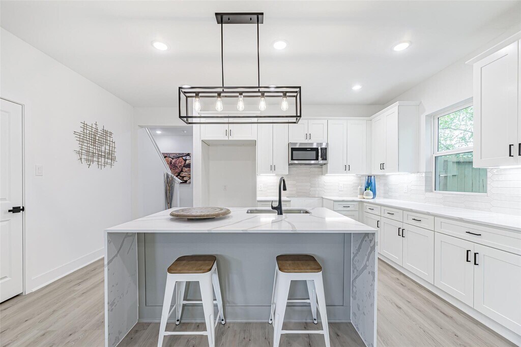 REQUIREMENTS: Proof of income, 3 months paystub and/or 3 months bank statements for any potential tenants 18+. Once landlord has reviewed the application(s), tenant(s) will need to submit information for credit and background check using a link that will be provided as well as complete a screening on at no charge ($0) to acknowledge applicable NO PET policies. DESCRIPTION: This contemporary house with elegant design and high-end finishing is tucked away in Sunnyside. There are three bedrooms and two and a half bathrooms in this property. Visitors are greeted by a large, open-concept living space that is emphasized by the waterfall island and Level 3 quartz countertops. Modern stainless steel appliances, under-cabinet lighting, sophisticated fixtures, and matte black hardware are all features of the kitchen. Since there is no carpet throughout, the room is flooded with natural light from the enormous windows, which is further accentuated with modern recessed lighting to create a light and welcoming feeling.