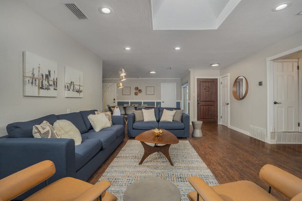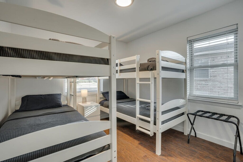 Feel at home in this centrally located vacation home, just minutes from Dallas’ prime attractions. This home offers 5 bedrooms and 3 bathrooms. This amazing vacation home offers a beautiful balance of clean modern design accented with rustic accents and homey touches. The large living area is perfect for gathering with friends and family. The fully equipped chef’s kitchen has everything you need to cook up a storm, including stainless steel appliances, such as a fridge, freezer, stove, oven, dishwasher, and microwave, cooking essentials, including a coffee machine and toaster, and a breakfast nook with seating for 2. The dining room offers a sophisticated restaurant feel and atmosphere with a dining table with seat settings for 8, plate settings, and cutlery. The spacious living room features two couches and two sofas for plenty of seating, a flat-screen TV, high-speed Wi-Fi, a designer rug, a coffee table, and a poker table with seating for 8. There is an outdoor swimming pool, a hot tub, a poolside deck with a conversation set and string lights, and a patio with a BBQ grill and outdoor dining set. A laundry room is fully equipped with a washer and dryer. Free parking is available to all guests in the garage and on the driveway. An additional nightly rate applies for more than six guests. Come experience the best of Dallas! A bustling cosmopolitan known for sports, history, BBQ, and frozen margaritas, Dallas is home to more than a dozen neighborhoods and districts that each have their own distinct vibe and attractions. Some attractions you won’t want to miss are The Sixth Floor Museum at Dealey Plaza, Reunion Tower, Perot Museum of Nature and Science, and Dallas Cattle Drive Sculptures. Smoking of any type is not allowed and violations are subject to a $450 fine plus the cost to clean, deodorize, and repair damages. Parties or large unauthorized gatherings of any sort are not allowed. Only registered guests will be allowed on the property. A noise alert device is installed in the home to measure decibels and send alerts in case reasonable noise levels are exceeded. Check-in is at 4pm and check-out is at 10am. Room 5 will be opened for groups of 12+ guests. Pets should be discussed in advance and are only allowed if they are house-trained and kept off beds and furniture; pet cleaning fees apply. Registration Number: 392450 [SI]