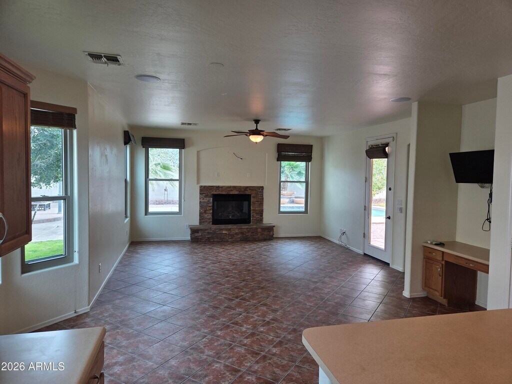 Stunning home is located in a private gated community. Come enjoy mountain views,walk trail access and convenient amenities nearby. Spacious single level home welcomes you in with a huge formal living/dining space featuring a picture window looking out over the resort style backyard. Island kitchen includes a double convection oven,breakfast bar,built-in desk area and overlooks the large family room with stack-stone fireplace & surround sound. Owner's suite is split for privacy and includes a dual vanity,separate tub & shower plus a huge walk-in closet. Backyard is a true show stopper! Covered patio with electric awning for shade,huge pool with relaxing water features,custom pavers and pergola for entertaining plus a double gate on the side to store toys. More... Security System is not warrantied by the Landlord.
