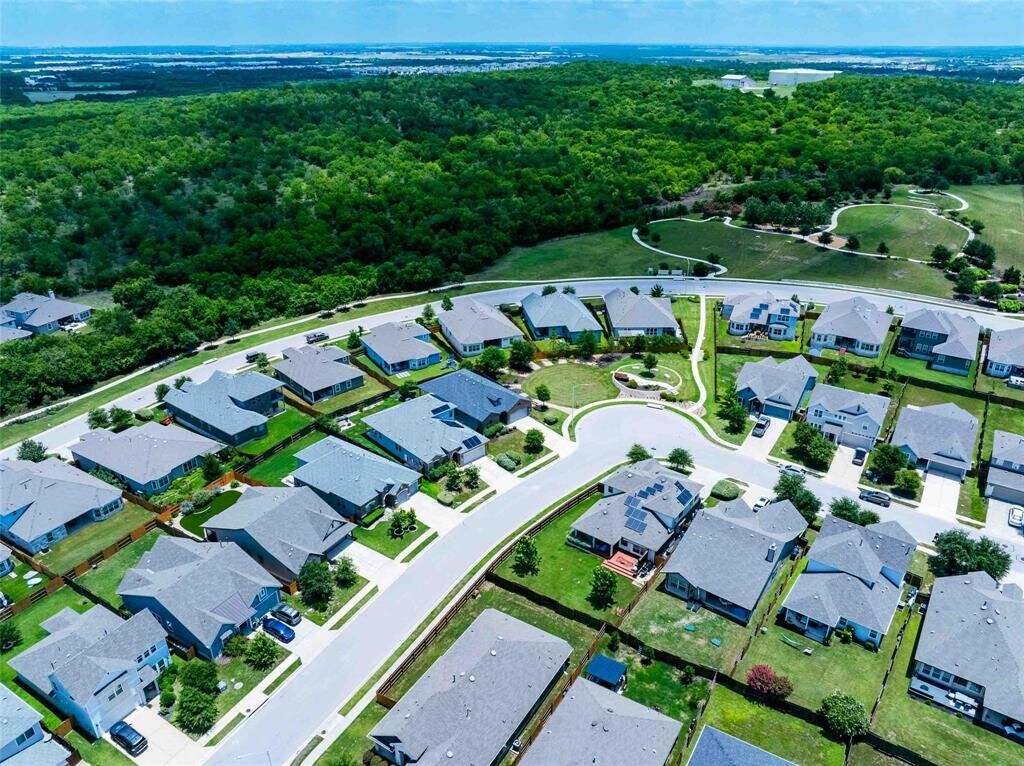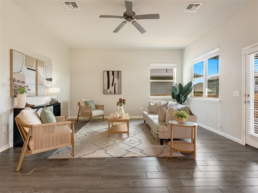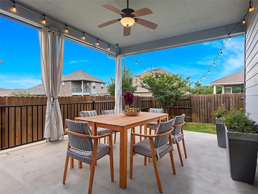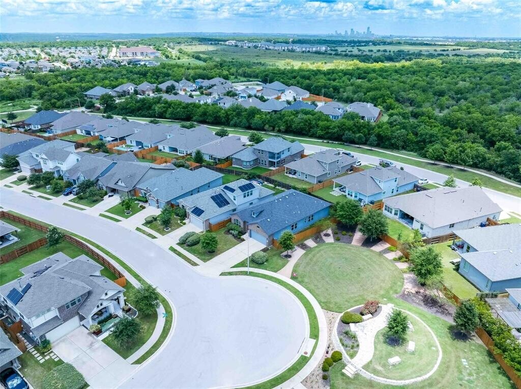 Located in the vibrant Easton Park community, this well-maintained single-story home offers a bright, open layout with soaring ceilings and beautiful wood-look tile flooring throughout. With only one neighbor and green space on the other side, enjoy both privacy and a peaceful setting. The spacious eat-in kitchen features an island with bar seating and flows seamlessly into the living areas, with a separate formal dining room that can easily serve as an office, home gym, playroom, or flex space. Large windows bring in abundant natural light, and neutral finishes create a warm, inviting atmosphere. Step outside to a large covered patio and custom hardscaped entertaining area—perfect for relaxing evenings or weekend get-togethers. Easton Park offers top-tier amenities including a resort-style pool, fitness center, miles of trails, and lively community events. Trolley Park is just around the corner for playdates and pup adventures, while the new 21-acre Skyline Park features zip lines, downtown views, and something for all ages. This home is move-in ready with washer, dryer, and fridge.