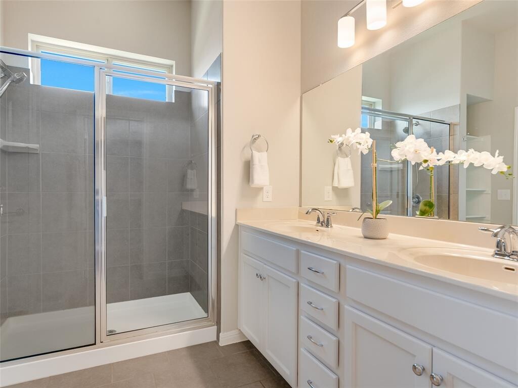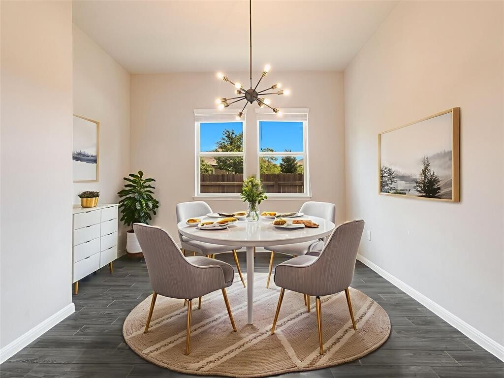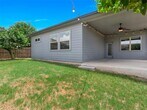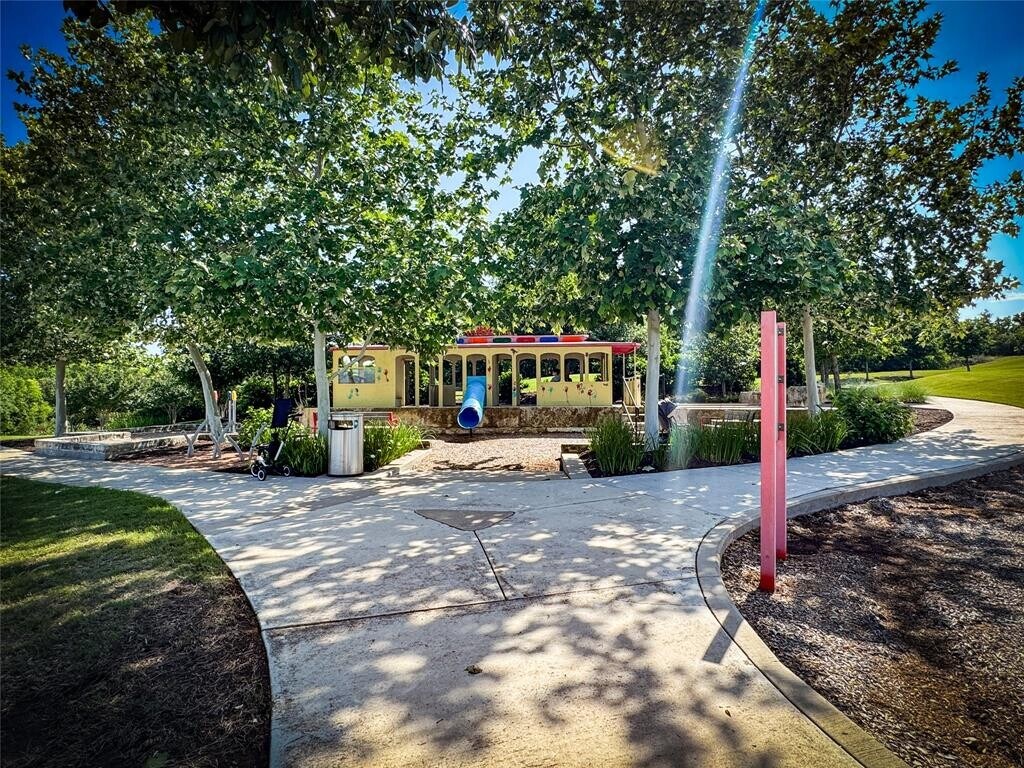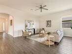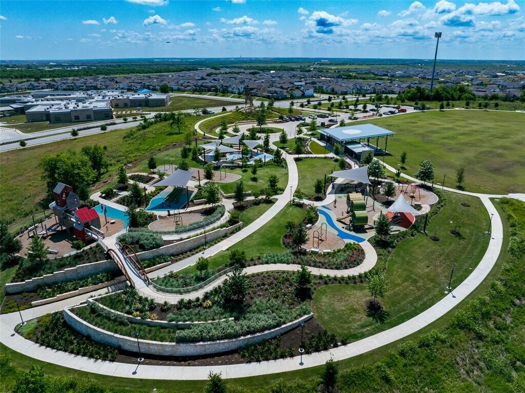 Located in the vibrant Easton Park community, this well-maintained single-story home offers a bright, open layout with soaring ceilings and beautiful wood-look tile flooring throughout. With only one neighbor and green space on the other side, enjoy both privacy and a peaceful setting. The spacious eat-in kitchen features an island with bar seating and flows seamlessly into the living areas, with a separate formal dining room that can easily serve as an office, home gym, playroom, or flex space. Large windows bring in abundant natural light, and neutral finishes create a warm, inviting atmosphere. Step outside to a large covered patio and custom hardscaped entertaining area—perfect for relaxing evenings or weekend get-togethers. Easton Park offers top-tier amenities including a resort-style pool, fitness center, miles of trails, and lively community events. Trolley Park is just around the corner for playdates and pup adventures, while the new 21-acre Skyline Park features zip lines, downtown views, and something for all ages. This home is move-in ready with washer, dryer, and fridge.