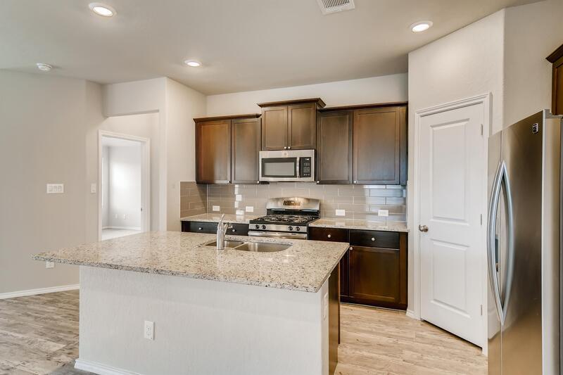 Ready for Move-in!! Deposit-Free Living w/ Obligo! Immaculate and inviting Single Story home! Features 3 Bed, 2 Bath, and an Office. Step inside to discover luxury vinyl flooring, and carpet in bedrooms only for easy care and comfort. The island kitchen has beautiful granite counters, ample cabinet space, gas cooking, and S/S appliances. The master bedroom has an extended walk-in shower, dual vanities, and a spacious walk-in closet. The backyard faces an open greenbelt. *Tankless Water Heater, Sprinkler System* (Fridge Stays/Not Warrantied) --- All T2M Real Estate residents are enrolled in the Resident Benefits Package (RBP) $55.95/month offering a smarter, easier renting experience with built-in protection/insurance and perks. ---