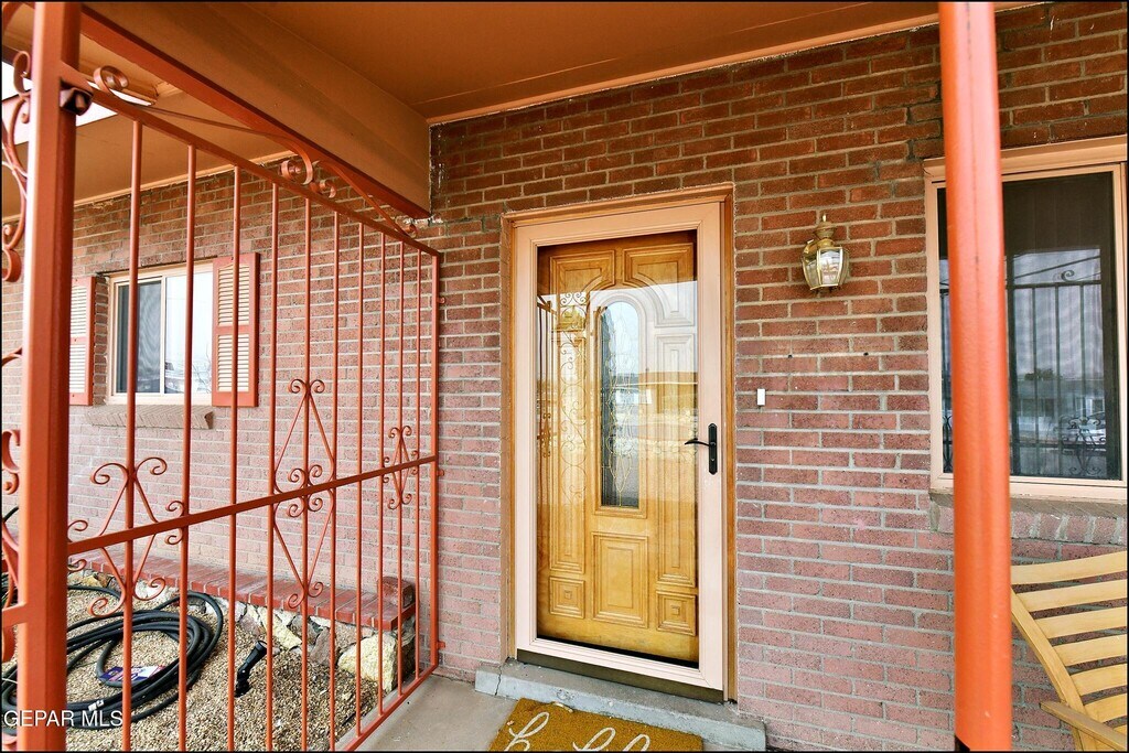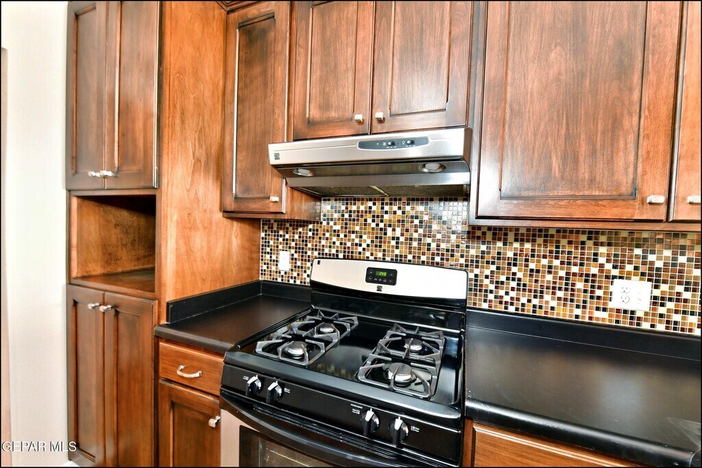 A private backyard oasis sets the tone for this 3 bedroom,2 bath home with a sculpted pool,integrated spa,and desert landscaping bordered by stone walls. The covered patio provides shaded outdoor space while the curved pool deck encourages relaxed gatherings. Indoors,polished hardwood flooring enhances the entry and living spaces,while tile transitions lead into a thoughtfully updated kitchen with dark wood cabinetry,mosaic backsplash,stainless gas stove,and black refrigerator. The adjacent living area features a rounded brick fireplace and built-in bar with wood panel detailing for added character. Both bathrooms present tiled surrounds and updated fixtures,maintaining a cohesive aesthetic. Positioned near Franklin Mountains State Park and minutes from Cielo Vista,the location offers access to recreation,retail,and dining. Deposit-Free Renting service to Obligo qualified renters,fees may apply.
