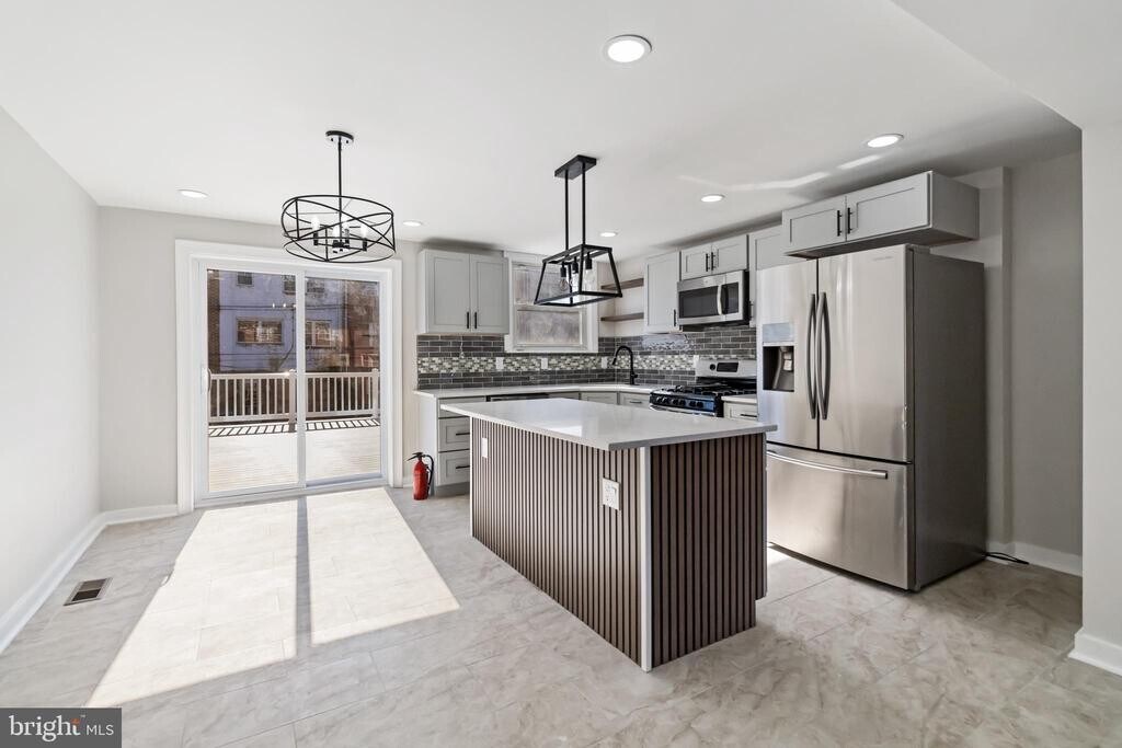 Video recorded tour is available and can be sent by text or email upon request. This beautiful newly renovated townhouse in Mt Airy is conveniently located near shopping centers, a wide variety of restaurants, and public transportation. It features 3 large bedrooms, 1 full bathroom, a huge outdoor deck in the back, a front yard & porch and a finished basement that can be used as additional living space or storage. The house has a open layout with living room, dining area and kitchen; also has central air, a washer & dryer and off-street parking for 2 cars. All stainless steel appliances in the kitchen with Quarts counter top. Also recess lighting and hard wood flooring through out the house. Small dog or cat is acceptable with owner's approval and will require additional pet deposit and pet rent. Owner is a PA real estate agent. Minimum 1 year lease Renter responsible for gas, water and electric First month, last month and security deposit required for move-in