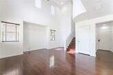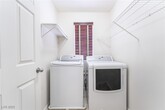 Spacious two-story home featuring an open floor plan with laminate flooring downstairs and neutral carpet upstairs. The inviting living area offers vaulted ceilings, a ceiling fan, and a media niche, seamlessly connecting to the dining area and kitchen. The kitchen is equipped with granite countertops, built-in microwave, and all appliances included. Upstairs, the large primary suite boasts a ceiling fan and a generous walk-in closet, while the additional bedrooms also include ceiling fans for comfort. A conveniently located laundry room includes a top-of-the-line washer and dryer. Enjoy a nicely sized patio, perfect for relaxing or entertaining outdoors.