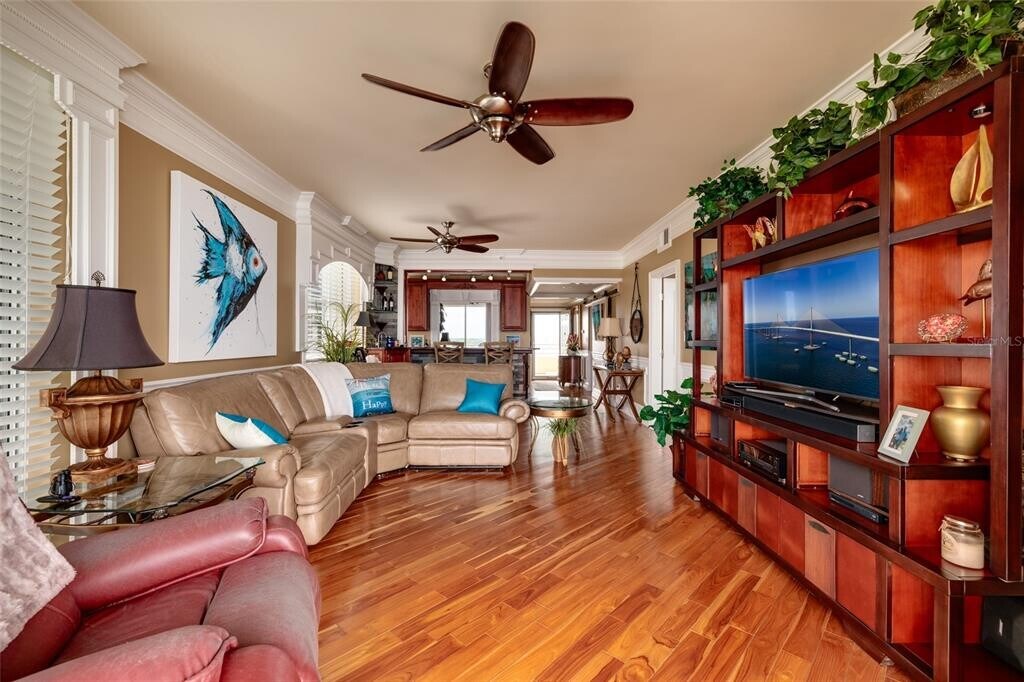 Here is your chance to live in a completely updated 2 bedroom 2 bath condo with a den that is on the intracoastal water way. This corner unit is spacious and bright. Enjoy elegant crown molding,wood floors,a wet bar,water softener,storm shutters,and an expanded den perfect for extra living or office space. This end unit has two spacious balconies,you have the front one for the sunrises and enjoy the sunsets from the back one. This unit also has an under building parking space and is located in the highly desired resort community of Harbourside. It has 6 pools,spa,his & hers gym with sauna,tennis/pickleball courts,billiards room,cards room,library,wood working room,gas grills,shuffleboard courts,marina,car wash vacuum/air stations and a sidewalk that is a mile and a half one lap almost completely water side. The unit is being rented furnished. MLS# TB8488316