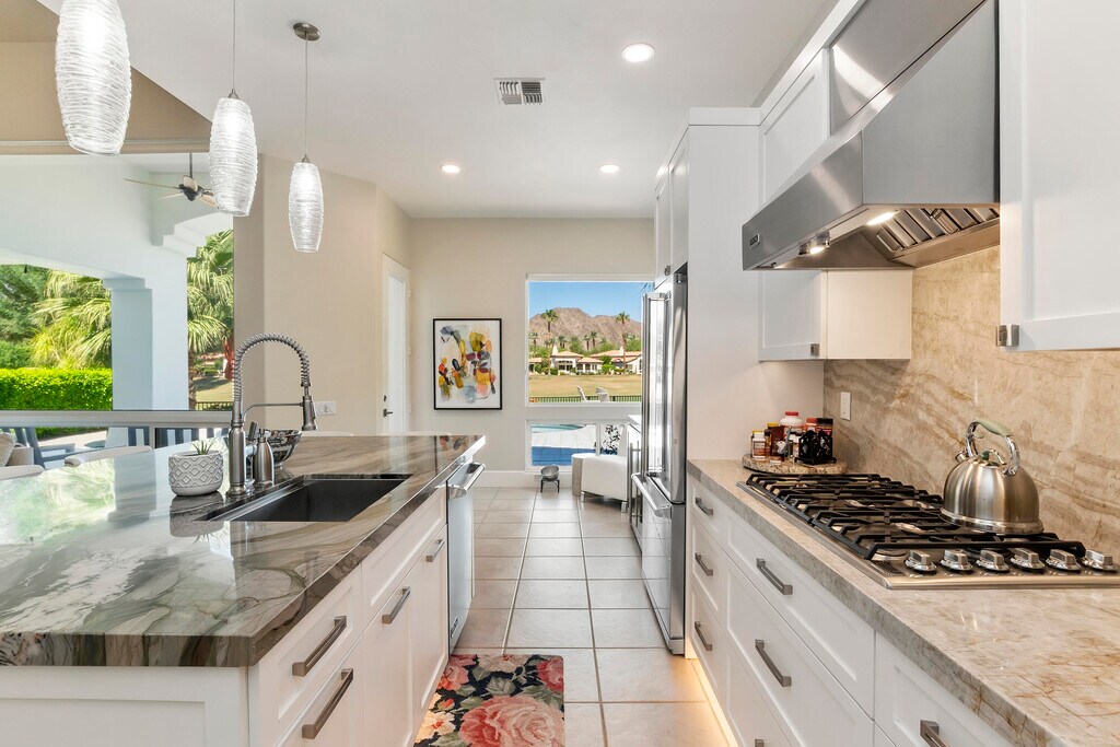 Experience luxury living alongside spectacular golf course views in the much coveted Rancho La Quinta Country Club. High atop the 3rd fairway of the Jones course,this gorgeous remodeled home comes completely furnished with 2 bdrms inside both with King beds & ensuites. The 2 bdrm guest casita comes complete with a King and two twins sharing a Jack and Jill bathroom. With its open concept design,the spacious living area flows seamlessly into a gourmet kitchen equipped with modern appliances and ample counter space creating an inviting atmosphere perfect for entertaining. Step outside to your private oasis featuring private pool and outdoor BBQ with a seating area to enjoy the golf course views and the warm Santa Rosa mountains! Call for Availability for the 2026 season!