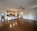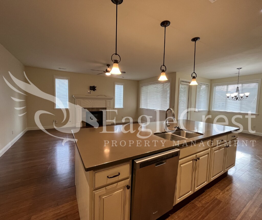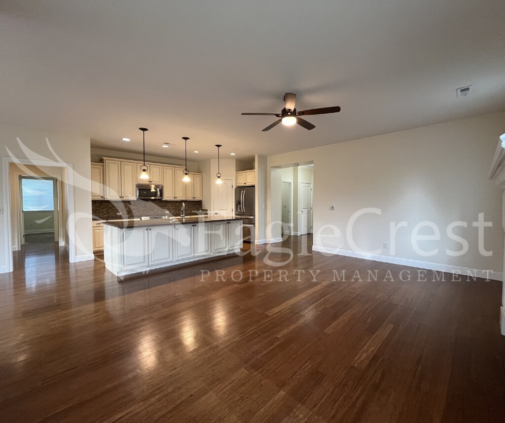 Welcome home to this beautifully designed 3-bedroom, 2-bath home offering 1,636 square feet of comfortable living space in a charming neighborhood near scenic walking paths. Featuring hardwood flooring throughout and a neutral color palette, this home is filled with natural light from large windows that create a warm and inviting atmosphere. The open-concept living and dining area is highlighted by a cozy gas fireplace with an elegant decorative mantle and modern remote-controlled ceiling fan fixtures. The spacious kitchen boasts cream-colored cabinetry, a large island with breakfast bar seating, corner pantry, and stainless steel appliances including an electric stove, microwave, dishwasher, double-door refrigerator, and garbage disposal. The generous primary suite offers a large walk-in closet and a luxurious on-suite bathroom complete with a deep soaking tub and expansive walk-in shower. Additional features include a utility room with washer and dryer hookups and extra storage cabinets, a two-car garage with ample shelving, and a lighted outdoor patio just off the dining area—perfect for relaxing or entertaining. Backyard Landscaping Is Tenant Responsibility Tenant Pays A Flat Rate Fee $200.00 For Water/Sewer Tenant Is Responsible for Electric/Garbage/Gas