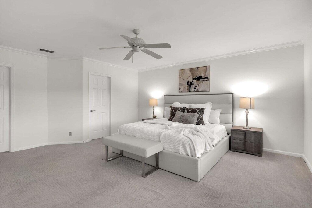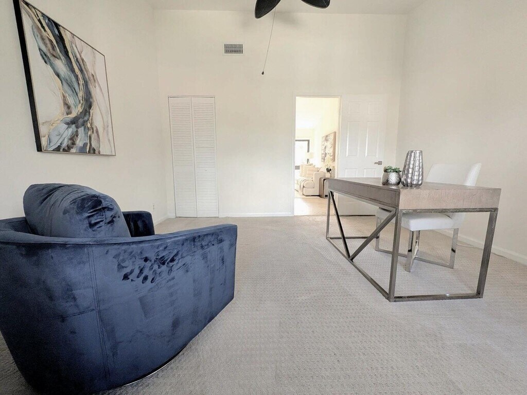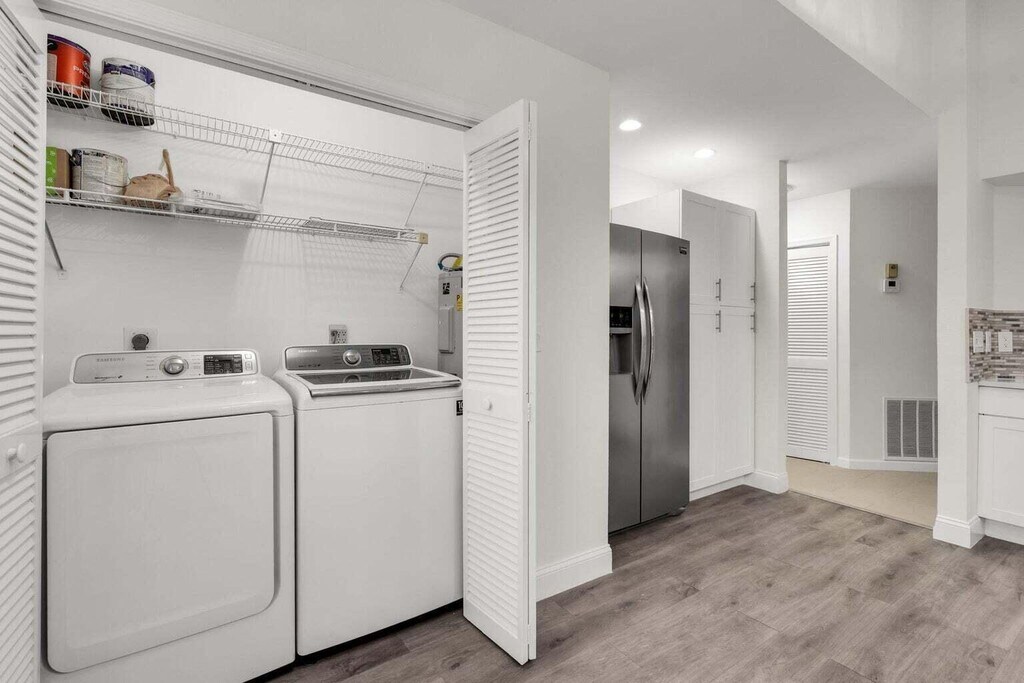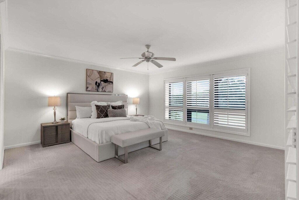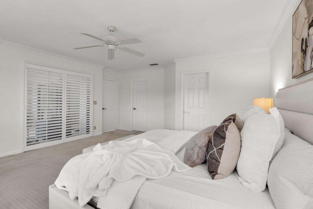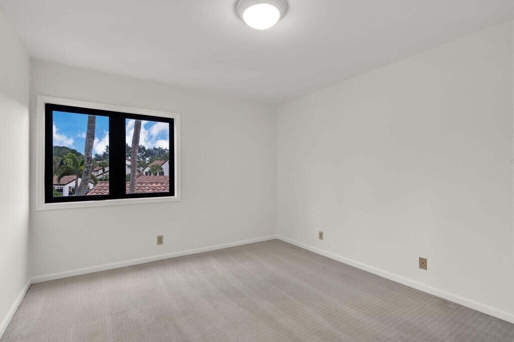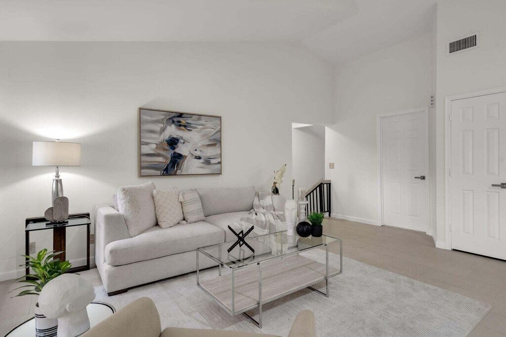 Welcome to the gated community of El Viento at Boca Pointe! This rarely available 3-bedroom, 2-bath top-floor corner unit offers an updated interior with a spacious open floor plan and vaulted ceilings throughout the living room and kitchen, creating an airy, expansive feel. The renovated kitchen features stainless steel appliances, Quartz counter tops and ample storage with a full size washer & dryer for added convenience. The oversized primary suite is bathed in natural light, complemented by elegant plantation shutters. The primary bath boasts dual sinks, a separate walk-in shower and a soaking tub. The second and third bedrooms are bright and generously sized. Additional highlights include impact glass for security and peace of mind, two
