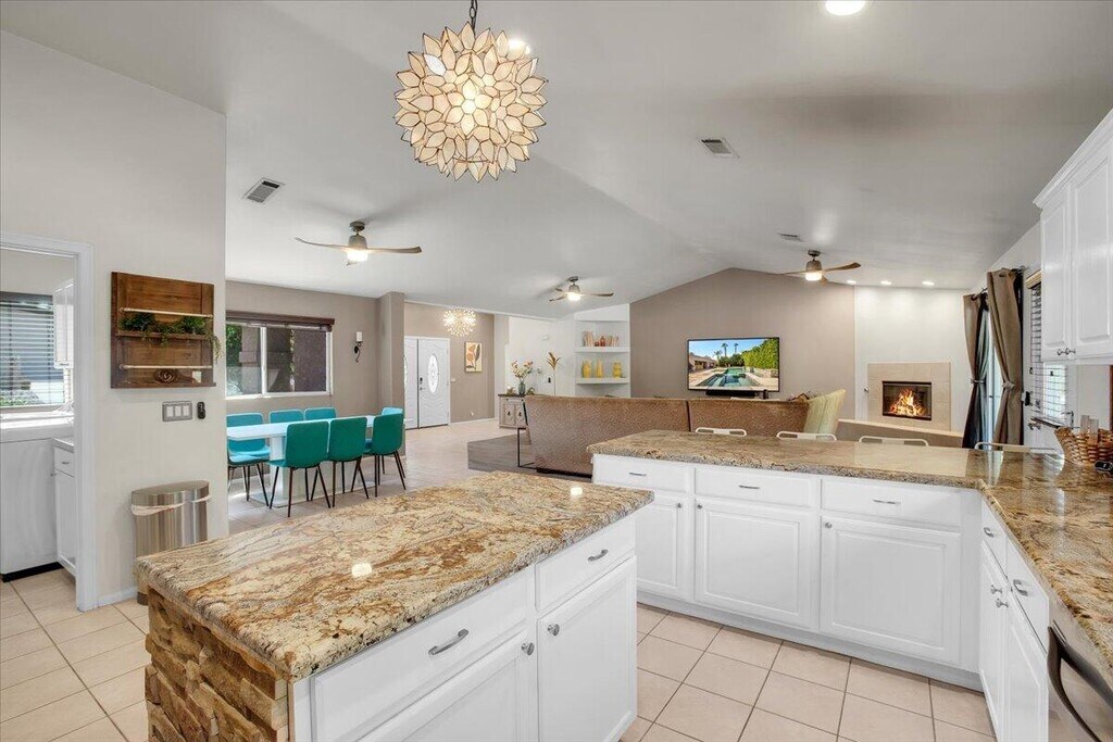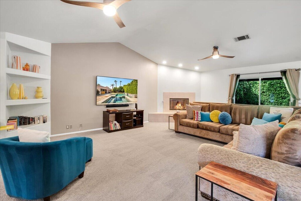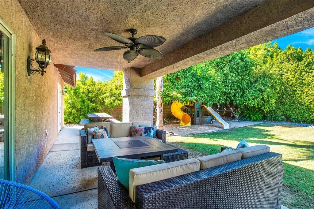 This terrific 4 bedroom 2-bathroom,2304 sq. ft.,home is located on a at the end of a cul de sac in 24 hour gated Bermuda Dunes Country Club. True GREAT ROOM floor plan with a gourmet kitchen with stainless steel appliances,refinished cabinets,granite slab counters,and breakfast counter bar is open to the living/dining area. The living area has a cozy fireplace for those cooler evenings plus a large flatscreen mounted on the wall with plenty of seating. The spacious primary suite has doors that open to the patio,a flat screen mounted on the wall and a Texas-sized walk-in closet is located at one end of the home for extra privacy. The primary bath has dual sinks,and a separate shower and beautifully tiled jetted tub. Another one of the bedrooms also has door that open to the patios. The very private rear yard is perfect for entertaining with patios off each side of the home,a covered gazebo,sparkling pool and spa,plus built in BBQ. This home also has a laundry room for your family's needs.