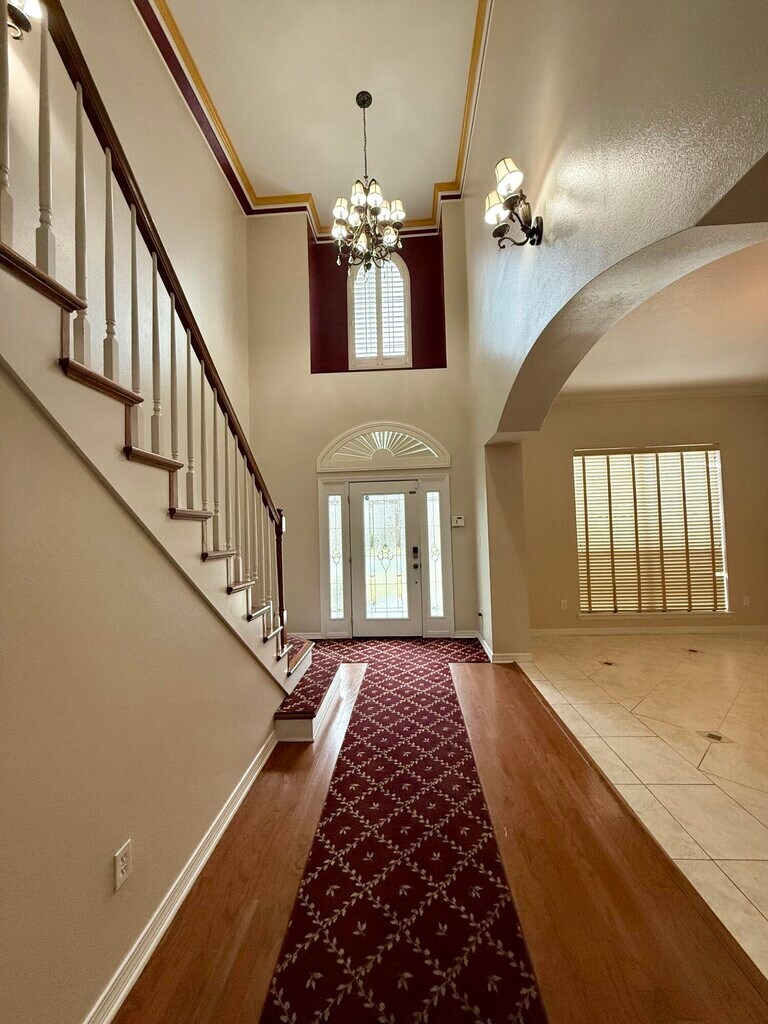 Wonderful two-story home with spacious rooms designed for convenience and privacy. A beautiful entry foyer with hardwood and tile flooring captivates immediately. The dining room is large enough to accommodate extended family/friends on special occasions, and the living room boasts a lovely natural gas fireplace. French doors separate the living and grand room. This home has 4 bedrooms, including a study/office area at the top of the landing, and 3.5 bathrooms; the master suite has been customized to include an impressive shower and closet area. A pool and hot tub complete this spectacular home.
