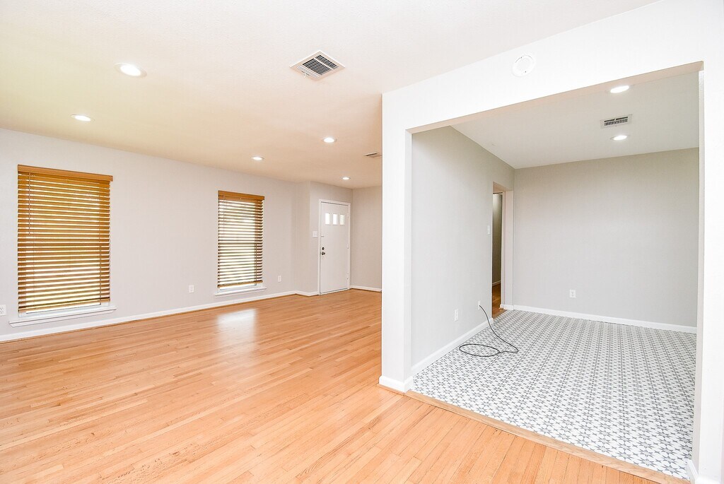 Charming Mid-Century–style home with modern updates throughout! Vintage starburst tile floors highlight the kitchen and dining area,paired with stainless steel appliances in a well-appointed chef’s kitchen. Original hardwood floors have been beautifully refinished,showcasing warm honey tones under recessed LED lighting in the open living space. A striking brick accent wall complements French doors that flood the home with natural light,creating an inviting atmosphere. Recent upgrades include PEX plumbing throughout,updated window treatments,a new roof (2024) & central HVAC. Located on a spacious corner lot close to all conveniences,including Spring Branch Village with popular ramen and local coffee spots. Refrigerator,washer,and dryer are included. Available now! MLS# 896011