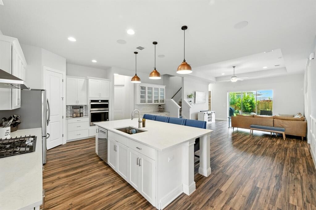 Available, move in ready now. Luxury awaits as you step into this designer's dream home. 4 bedrooms plus a large dedicated office, packed with high-end, custom details sets this home apart. Featuring over 2650 square first on the main floor and a bonus 400 square feet second floor flex space with full bathroom is ideal for an entertainment area, exercise space, or a multigenerational living space perfectly adaptable to your specific needs. Featuring 4 full bathrooms, including a luxurious primary ensuite, this home is as functional as it is stylish. The stunning kitchen boasts a gas range, deep sink, large island, tons of storage space and generous pantry. The formal dining area is open to the kitchen but tucked away enough to make it the perfect space for gatherings of family and friends. The fully landscaped and turfed backyard conveys with its own putting green. Enjoy the manicured backyard space from the comfort of the covered patio. The 3-car garage is perfect for multiple vehicles and/or storage depending on how you want to utilize the generous amount of space available. Easton Park offers a vibrant lifestyle with exceptional amenities including a community pool, multiple walking trails, playgrounds, and easy access to one of the best state parks in Central Texas - McKinney Falls. Just 15 minutes from Austin-Bergstrom International Airport and 20 minutes to downtown Austin, this home blends comfort, convenience, and design in one of the city’s fastest-growing areas. Pets negotiable. 18. month lease preferred.
