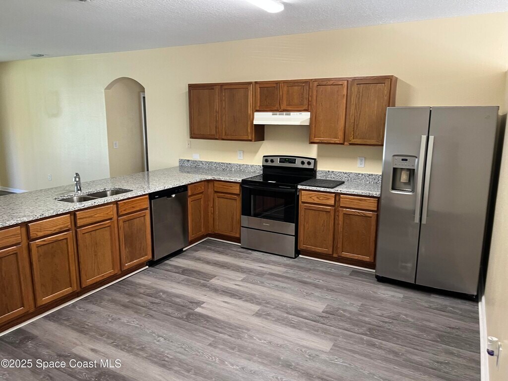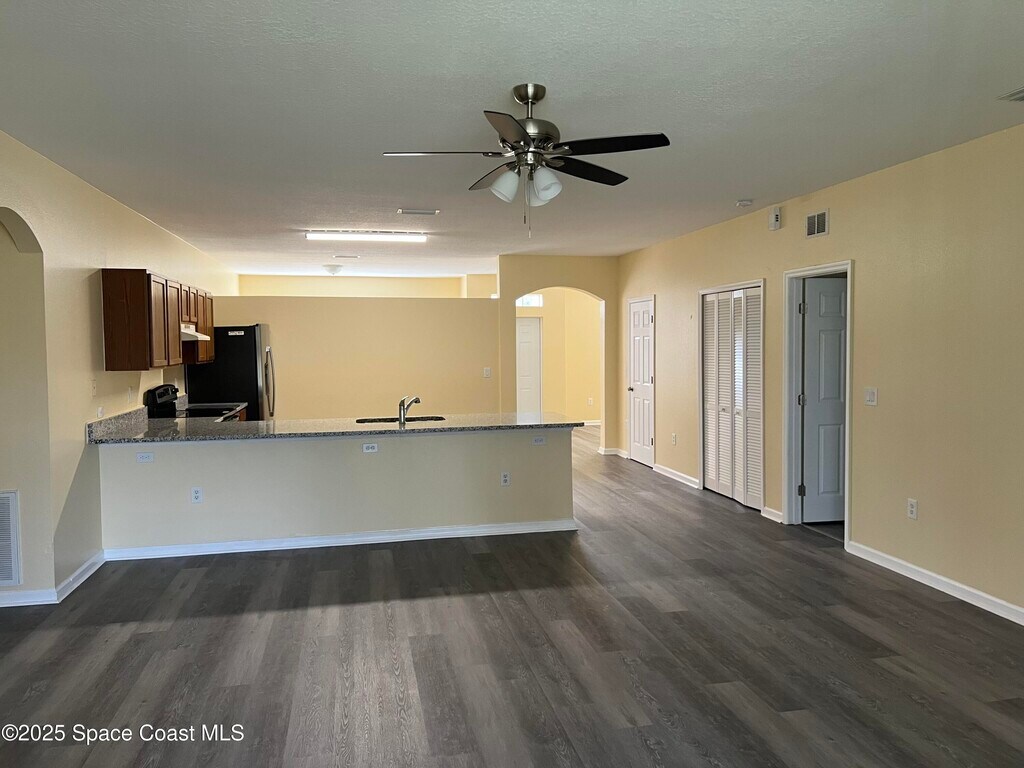 Excellent and remodeled rental located in a quiet established neighborhood in NW Palm Bay. The home offers a formal loving room,formal dining room and a large family room that opens to the eat in kitchen. Lots of cabinets with granite countertops and a very nice pantry. NEW VINYL PLANK FLOORING THROUGHOUT!! New paint and blinds and new paint Primary bedroom suite has a separate tub and shower with quartz counter top sink. Inside laundry room and nice size bedrooms. Secondary bathroom also has a quartz countertop. Fenced in back yard with a screened in trussed patio. Conveniently located to everything!!! Must see!!!!