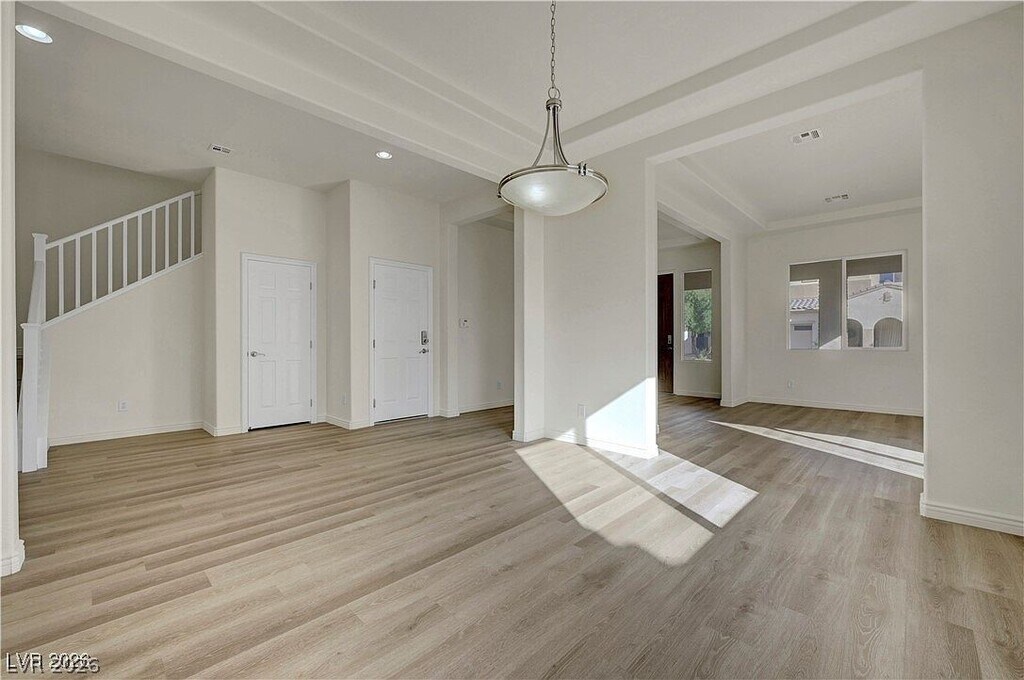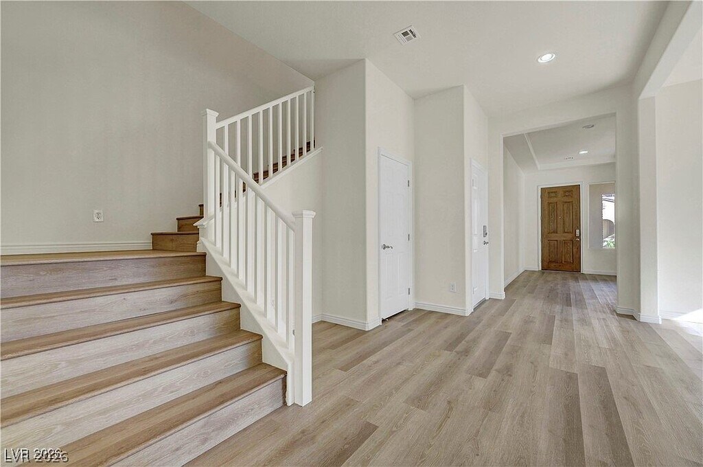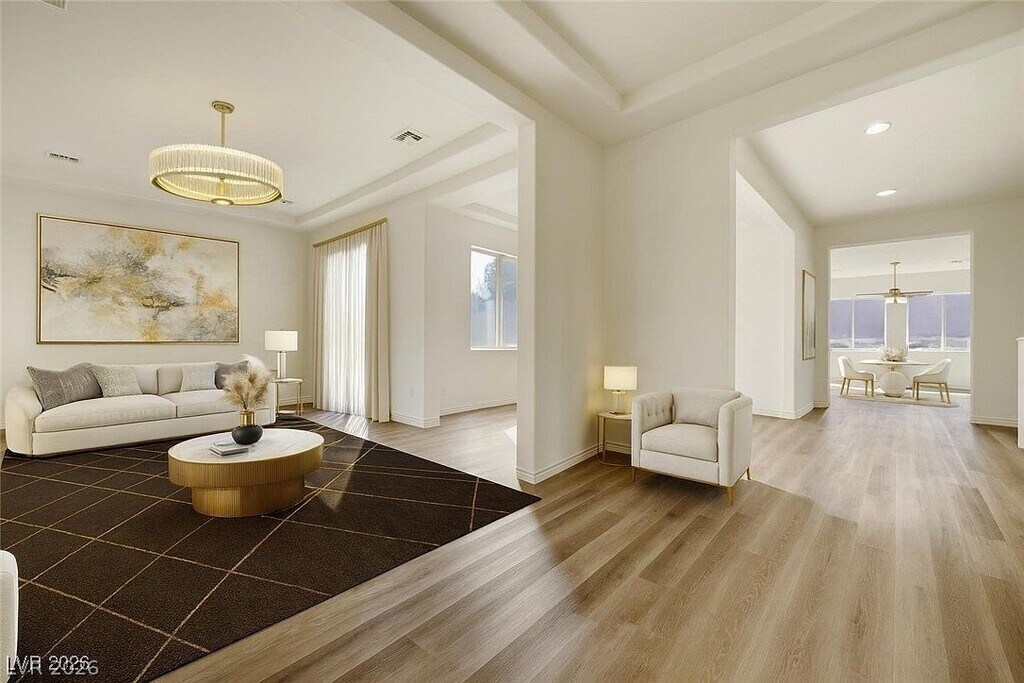 Experience elevated living in the prestigious guard-gated Cascades at Mountains Edge. Perfectly positioned on a premium corner cul-de-sac lot, this residence offers exceptional privacy and an impressive 7,841 sq.ft. homesite. Step through the entry courtyard into a refined formal dining room that transitions seamlessly into a grand, ultra-open living space anchored by an expansive luxury kitchen island—a true entertainer’s centerpiece. Sun-filled interiors, soaring openness, and elegant finishes create an inviting yet sophisticated atmosphere. The home features a desirable first-floor bedroom with full bath, an oversized loft upstairs, and a luxurious primary suite boasting mountain views and a spacious spa-style bath. Located in the rapidly growing Enterprise corridor with effortless access to Blue Diamond, premier parks, dining, and shopping. A rare offering of space, privacy, and upscale living.