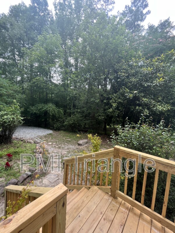 This three-bedroom, two-bathroom home has recently been remodeled and is ready to move in. Throughout the house, there is new flooring and fresh paint. New refrigerator, stove, washer and dryer. Wooden flooring can be found in the living room, dining room, and kitchen, while carpet can be found in the bedrooms and upstairs. This is a nature lover's dream come true, as it is surrounded by trees. Super private, with adequate space inside and out for everyone. This property, which is almost 2 acres in size, is lush with greenery. More storage with an additional shed outside. The house is at a walking distance to old Chatham golf course, American tobacco trail and around 5 minutes to RTP, highway 540, Parkside town commons (Target, Harris Teeter, Banks, Theaters etc.) Salary Requirements: 3 times the monthly rent. Security Deposit: 1 month rent for credit score 650 and above. Tenant pays all utilities. Owner will pay for HOA and yard maintenance. All Applicants above 18 years old must pass tenant screening, which includes background, credit and reference checks. Main applicant must have a minimum of 650 score or a guarantor. No eviction records. This is a non-smoking property. Pets allowed: Max 2, Pet Fee: $345, Pet Rental: $30/month