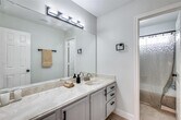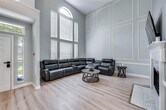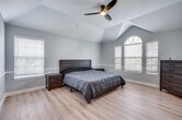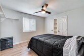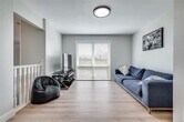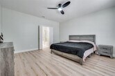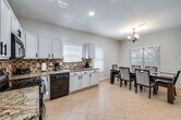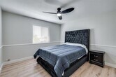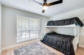 This two-story house offers a roomy, relaxed layout with five full bedrooms and two and a half baths, spread over 2,640 square feet. It's set on a corner lot in a cul-de-sac, which adds peace and privacy. Inside, you'll find updated laminate floors throughout and a layout made for both hanging out and having guests over. The living room features an oversized sectional couch, a smart TV, a coffee table, and an ornamental fireplace that adds enough character without fussiness. The kitchen is fully open to the dining area and comes ready with granite countertops, stainless steel appliances, and tons of cabinet space. The dining area seats six comfortably and sits right by a window for natural light. If you're into game nights or just need a bonus hangout zone, there's a game room with a foosball table and a table for two, plus an upstairs loft with another smart TV, a couch, and even a bean bag chair for kicking back. The main bedroom is on the ground floor and has a king-sized bed, a walk-in closet, a ceiling fan, and an ensuite bathroom with a walk-in shower, separate tub, double vanity, and private toilet area. Upstairs, you'll find four more bedrooms: two with queen beds and ceiling fans, one with a king-sized bed and dresser, and a fifth room that's perfect for kids or guests with a bunk bed (twin over double), desk, and ceiling fan. One full bathroom upstairs, with a tub-shower combo, and another half bath downstairs, make things simple for larger households or visiting friends. Out back, the fenced yard includes outdoor furniture, an eight-person dining table, a BBQ grill, and plenty of space to hang out under the trees. The Central, laundry hookups, and multiple parking options, including a two-car garage, driveway, and street parking. Pets are not allowed, and all utilities are included, making things just a bit easier to manage month to month.