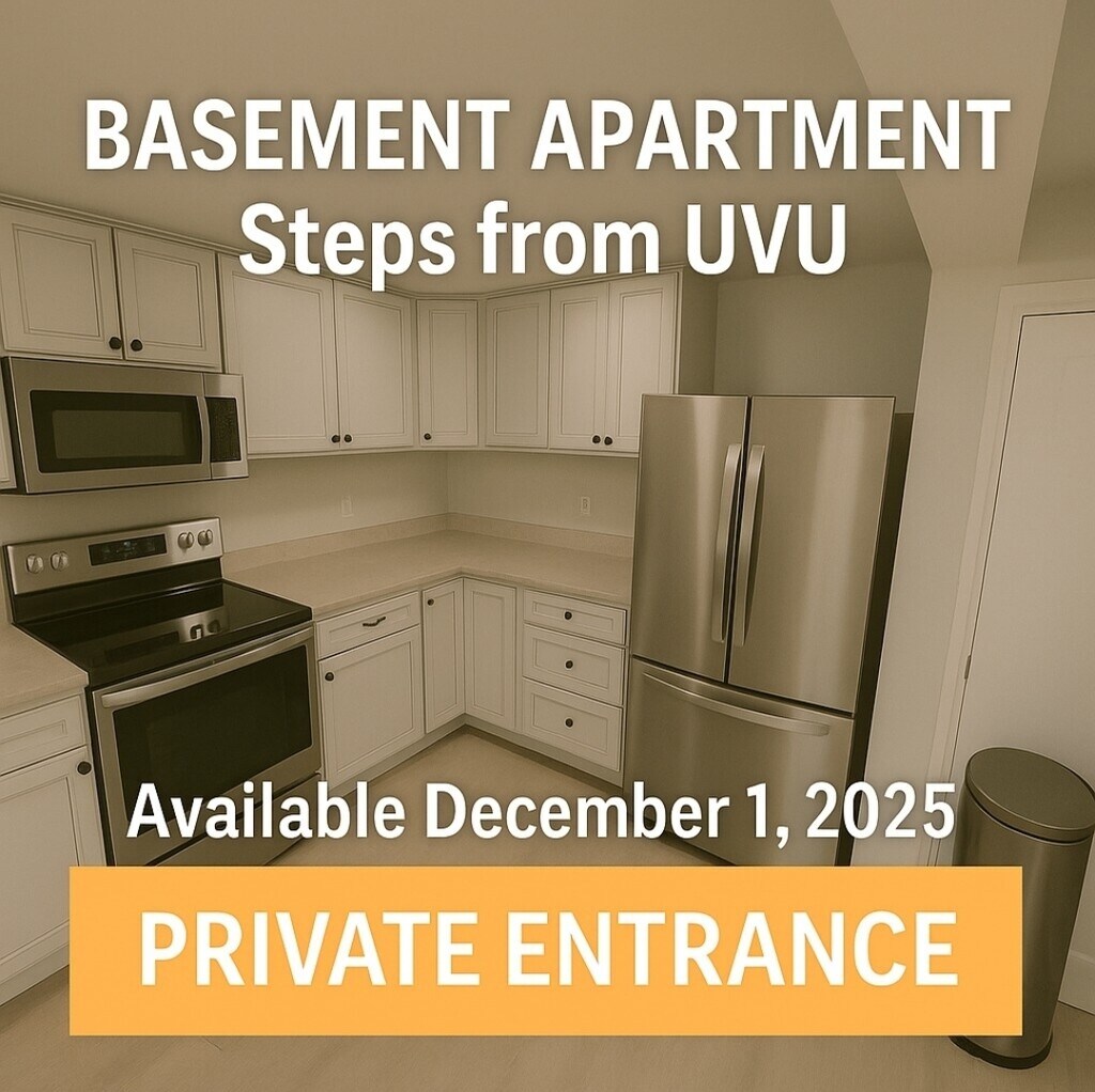 Ideal Basement Apartment with Private Entrance — Perfect for a Couple, One Student, or Two Students (preference given to students)Available: December 1, 2025Enjoy comfortable living in a prime location right next to UVU — just a 10-minute walk (or 2-minute drive) to most of campus, with quick access to BYU, I-15, shopping, dining, entertainment, and public transportation.Features:Private entrance for added privacy Two included on-site parking spots + plenty of public parking nearbyOne-car garage available/negotiable$150/month flat fee for Wi-Fi &; utilities (1 person) or $180/month (2 people)Pets:This is an owner-occupied home, so no dogs or cats. Other pets may be considered.?? Available December 1, 2025?? Near UVU, Orem UTContact us to schedule a private showing or to learn more about qualifications and details.