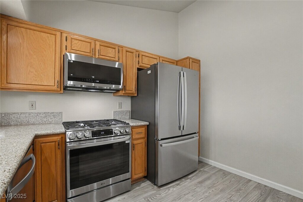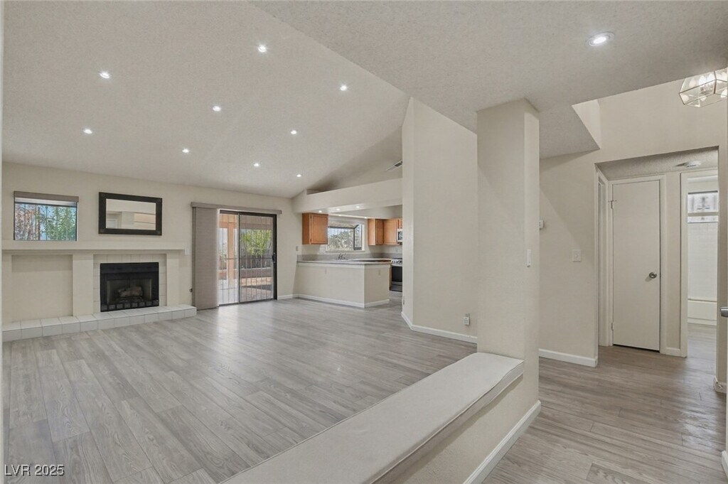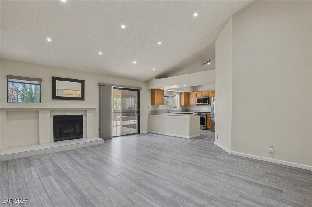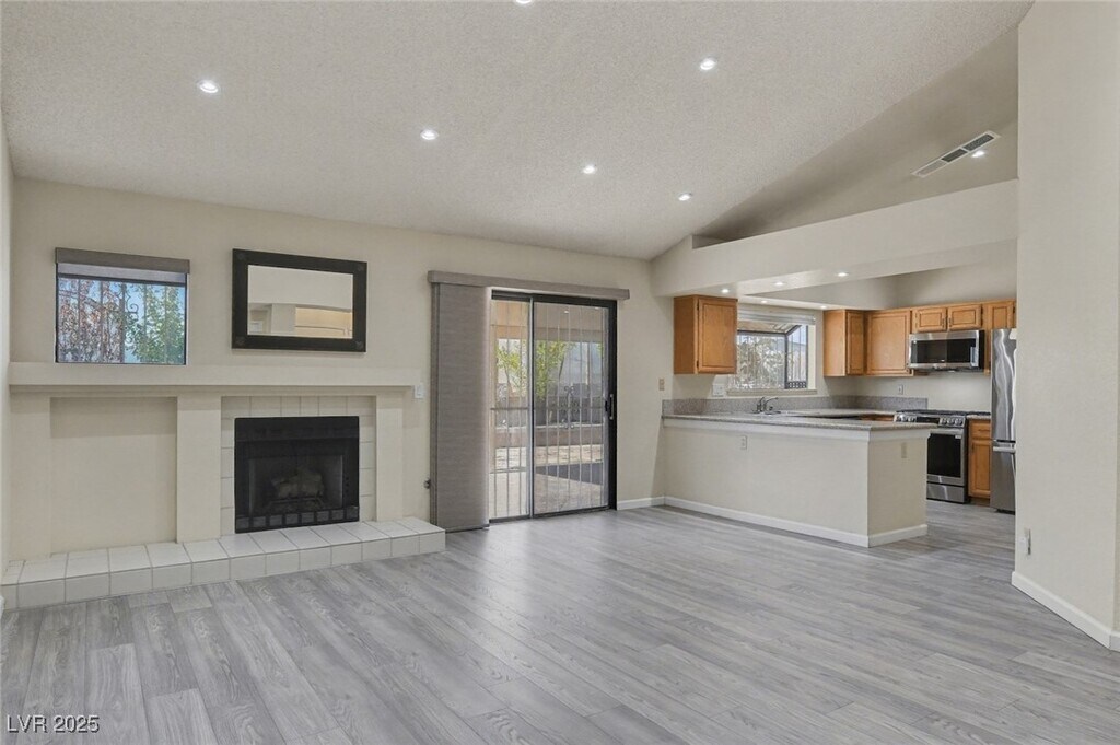 Welcome home to this upgraded single-story residence that features 3 spacious bedrooms and 2 full baths, the open-concept layout creates a seamless and inviting flow throughout the home. The living room centers around a cozy gas fireplace, perfect for relaxing evenings. Modern lighting and brand-new appliances elevate the kitchen and main living areas, adding both charm and practicality. Thoughtfully redesigned landscaping in both the front and back yards includes lush garden spaces and mature fruit trees, creating a serene outdoor retreat. Enjoy the added convenience of RV or boat parking and the privacy of having no rear neighbors. From your backyard, take in stunning views of the Las Vegas Strip. Conveniently located near major freeways and the airport, this property offers easy access to everything Las Vegas has to offer.