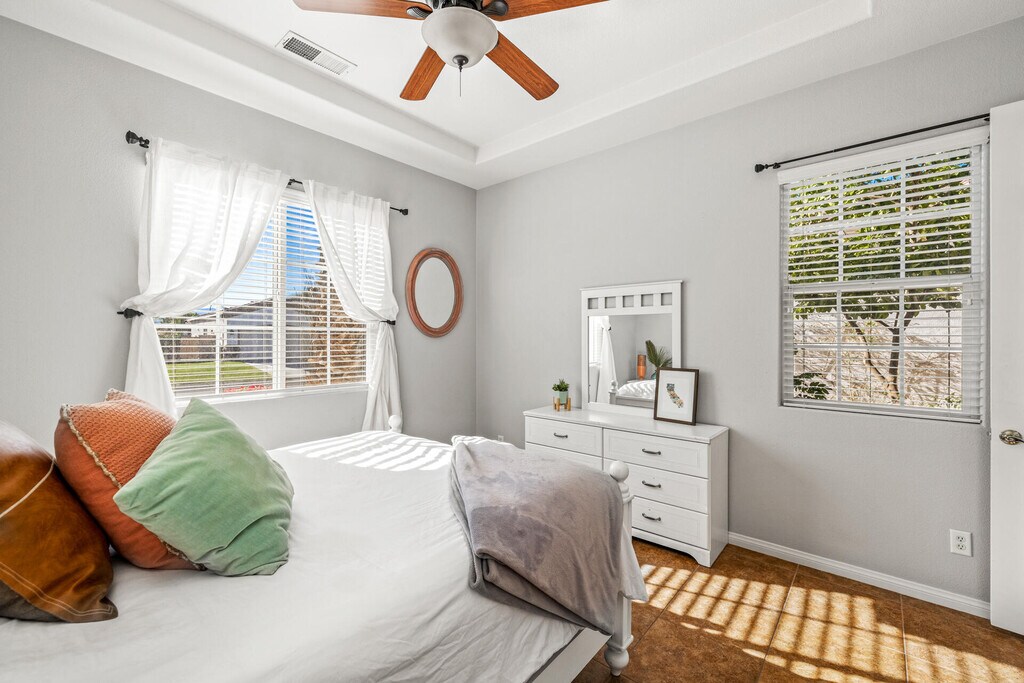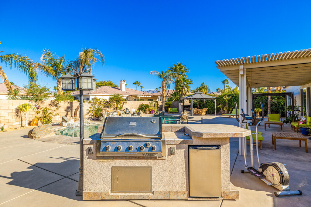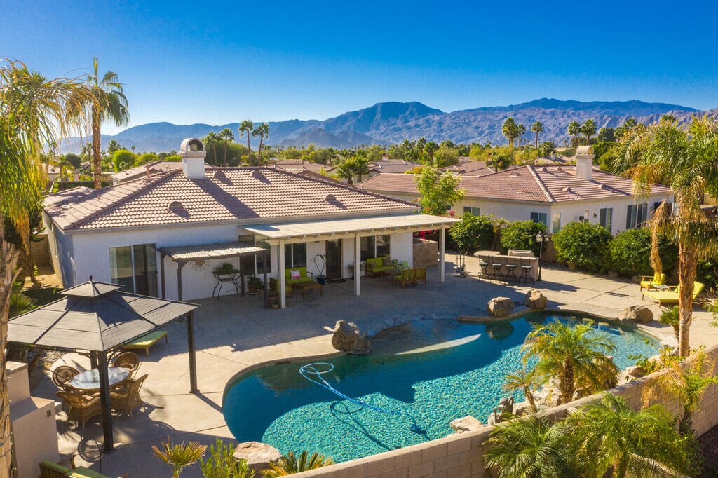 Seasonal is 6500.00 Sept- Dec $4500.00 This beautiful 3 bedrooms Plus den pull out couch. 3 bath home is located heart of La Quinta. The house is turnkey with everything you need to vacation. Open floorpan w/tile through out. In the backyard it has an outdoor Fireplace w/gazebo. Gorgeous,large custom salt water pebble tec pool with waterfalls is the centerpiece,flanked by a generous sized BBQ island,gazebo and gas fireplace! All surrounded by the backdrop of stunning mountain views! Gated community close to shopping,golf and award winning Dining! Just pack your bags and book your stay.