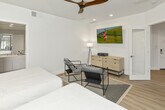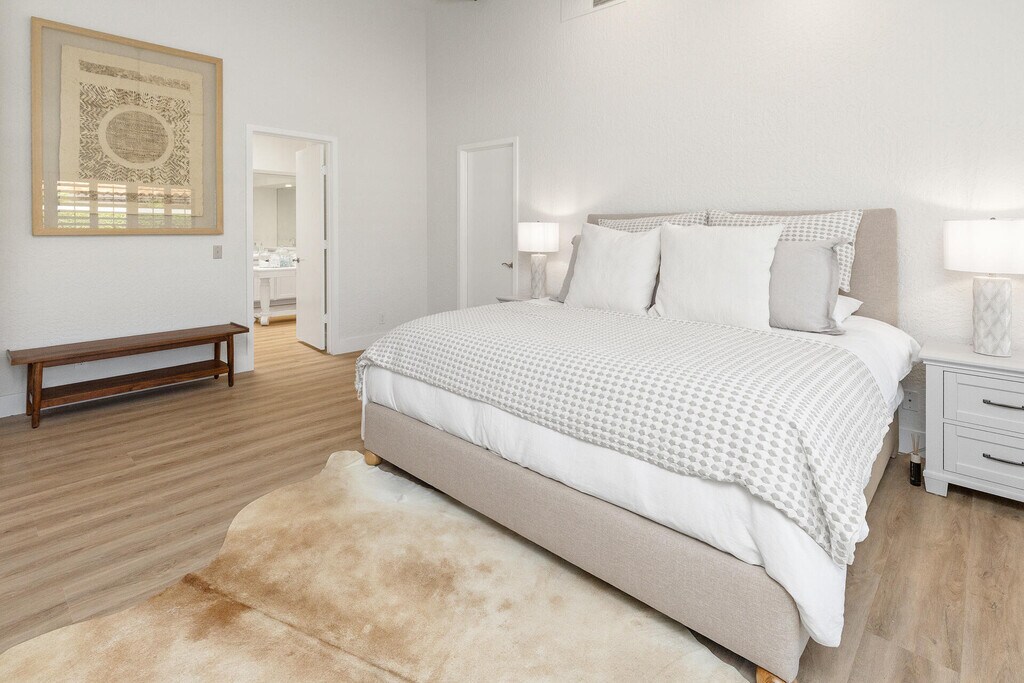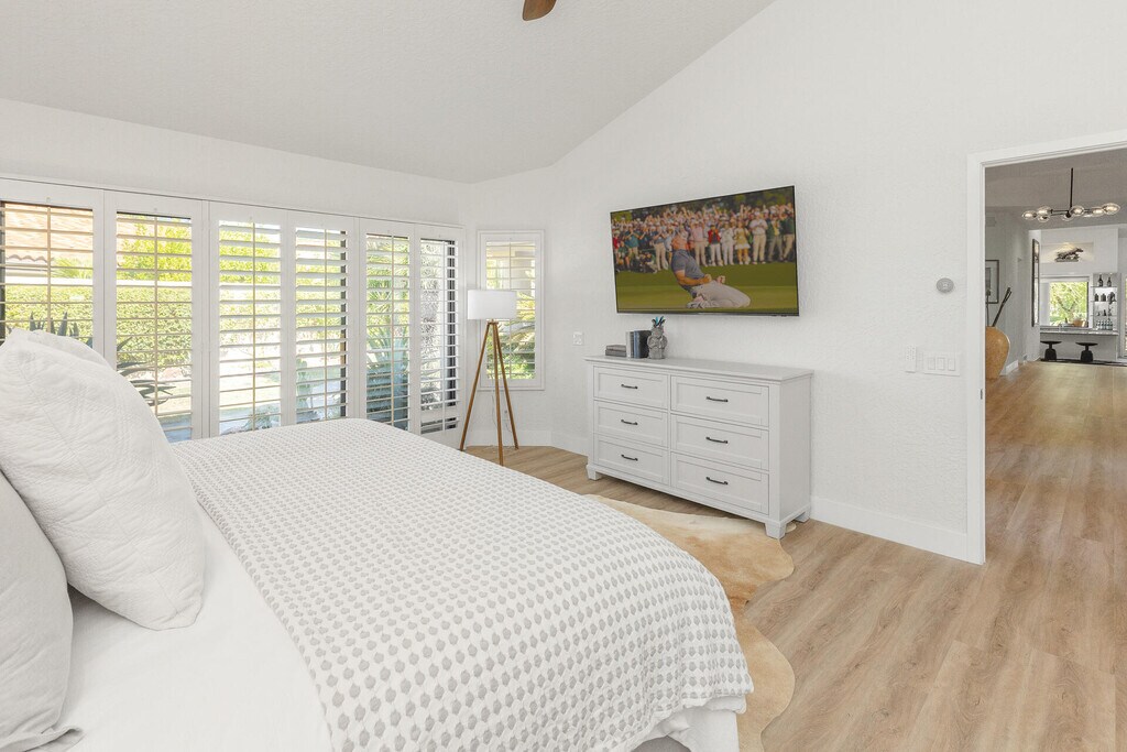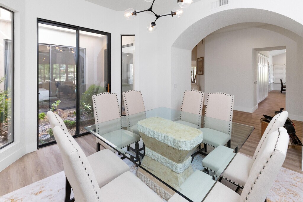 Tucked away on a quiet cul-de-sac overlooking the18th tee box of the coveted Nicklaus Private golf course inside PGA West. A private courtyard has been updated with pavered walkways and lush landscape. Outdoor spaces include a private,pebble finish pool with a tanning shelf and spa,multiple seating areas,built-in BBQ,island seating,built-in fire pit and electric awnings for additional shade.This area was designed for relaxation and fun offering golf course and mountain views,Upon entering the home you are met with a Desert Boho motif featuring new flooring,base boards,paint,soaring ceilings and a glassed-in atrium giving you a sense of bringing the outdoors to indoor living. Living room areas include a wet bar featuring refrigerator,ice maker and wine refrigerator. The fully stocked kitchen hosts new countertops,plenty of prep areas,new cabinetry,plenty of storage and open outdoor views. The spacious primary suite has an attached private bath with a free standing soak tub,new lighting,double vanity,new cabinetry and a large walk-in closet. Guest bedrooms are generous in size and each have their own private en-suite baths with ample closet space. This home comes with a multi-room sound system connecting through bluetooth for music throughout the home,is fully furnished and finely appointed. Two car attached garage with additional space for golf cart,ample additional parking for guests Everything is ready and waiting for you to come and enjoy.