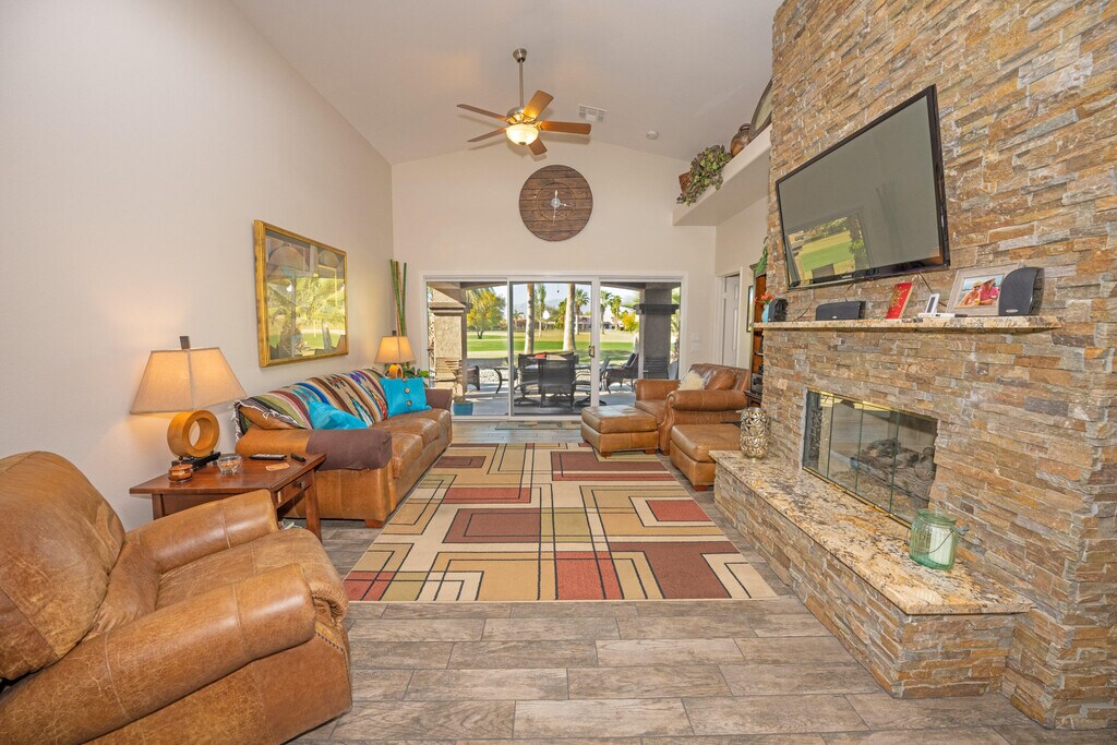 AVAILABLE WINTER 2025-26!! MONTHLY RENT SCHEDULE: Nov-Dec $4,500 - Jan-March $5,500 - April $6,500. No Pets. This updated Balboa plan on the 13th fairway offers expansive panoramic views of the golf course,mountains,and the lake between holes 15 & 16 of the Big Rock Golf Course at Indian Springs. This charming vacation home has two bedrooms with their own ensuites and an additional half bath off the living room. The kitchen has newer stainless steel appliances and lots of counter and cabinet space. Off of the kitchen is a bright and sunny space to get some work done with a desk and for additional overnight guests a hidden murphy bed. Bedrooms have 1 KING bed and 1 QUEEN bed and TVs. A spacious living room with ample seating,stacked stone gas fireplace and large flat screen TV. Outside there is seating for everyone,a fire pit,and a table and chairs for outdoor dining. Rent includes utility allowance,cable tv,internet and use of community pools and fitness centers. This is a monthly vacation rental only available on a monthly basis. No annual or long term rental periods. WINTER 2025-2026 MONTHLY RENT SCHEDULE: Nov-Dec $4,500 - Jan-Feb-Mar $5,500 - April $6,500. Rates,availability,and terms subject to change. Call or inquiry for availability,deposit and fees. Damage Deposit: $2,000,Booking Deposit: $500,Cleaning Fee: $250. Includes $300 utility allowance. No Pets. Rates,availability,and home features subject to change.