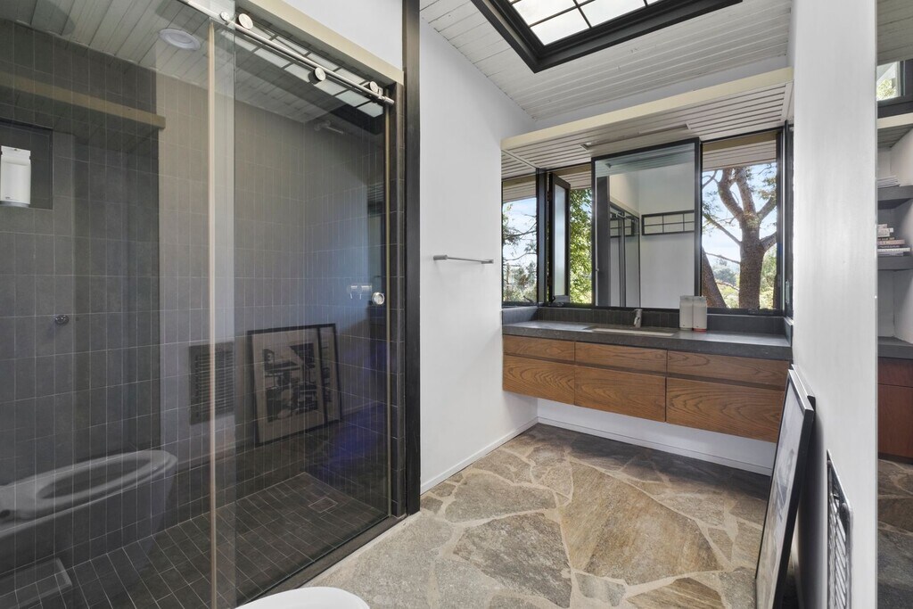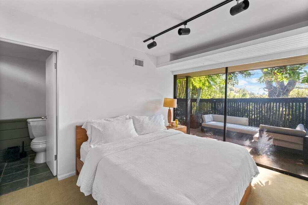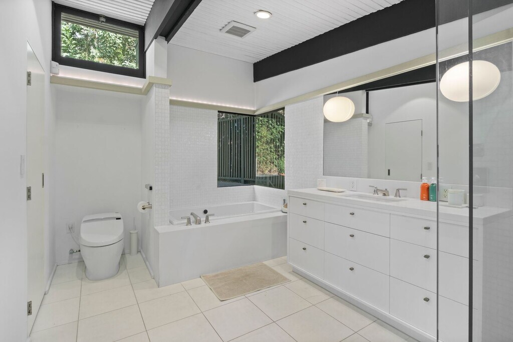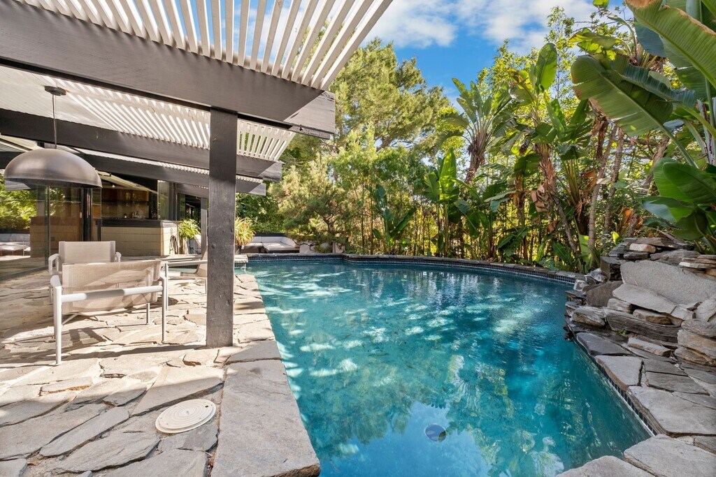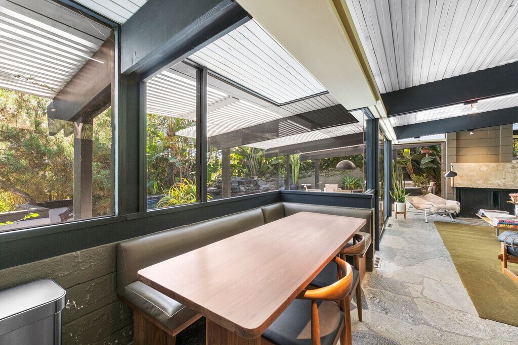 Rare opportunity to lease the iconic Sjoberg Residence, built in 1954 in the Hollywood Hills. Designed by Dutch architect John Sjoberg and captured by Julius Shulman for Modernism Rediscovered, this mid-century modern home features Brutalist accents and mature native landscaping for privacy. The post-and-beam construction offers an open floor plan with glass walls, creating seamless indoor/outdoor living. Highlights include a cement fireplace, upgraded kitchen with soapstone counters, Carrara marble, and custom stone and recycled glass tile work throughout. The main house features a primary suite with spa-like bath, a guest bedroom, and a modernized bathroom. A separate studio residence with a 3/4 bath, private entrance, koi pond, and waterfall offers flexible use for work or leisure. Outdoor spaces include a lagoon-style pool, meditation pavilion, and multiple dining areas with views of Laurel Canyon. This gated retreat is minutes from Hollywood and major studios, with two covered parking spaces. Don't miss this piece of Los Angeles history. The main house features 2 bedrooms and 2 bathrooms, approximately 1,600 sq. ft. The 3rd bedroom and bathroom are separate from the main house. Includes a 2-car side-by-side carport with additional parking in the driveway. Landlord covers pool, gardener, and koi pond maintenance; tenant is responsible for all utilities. Small dogs will be considered.