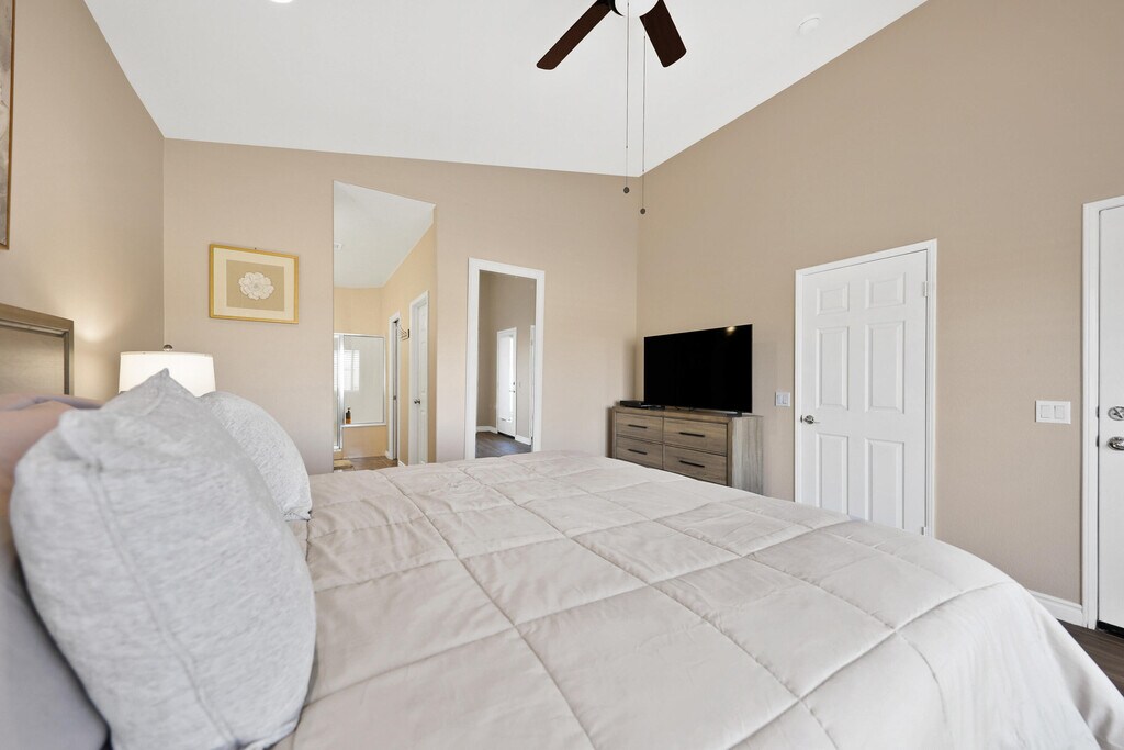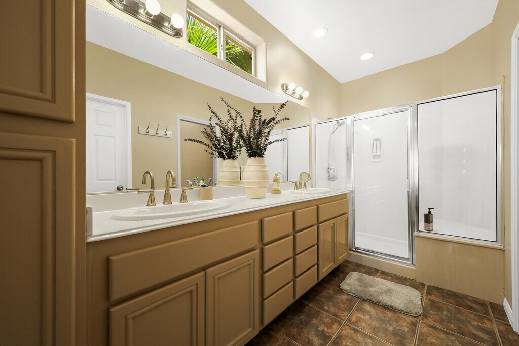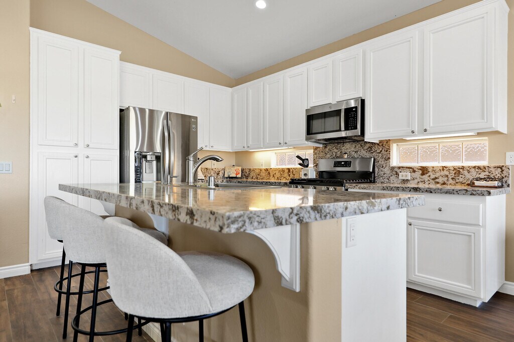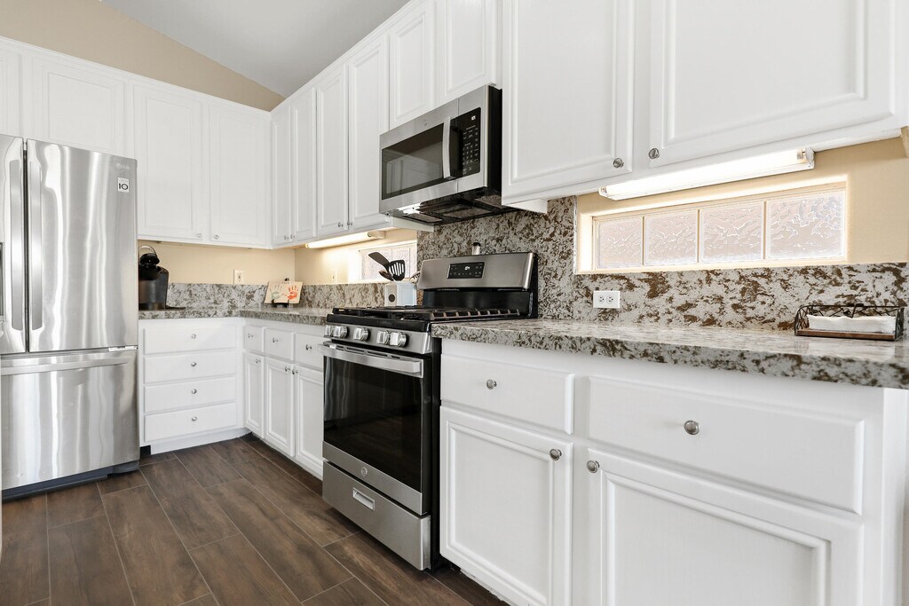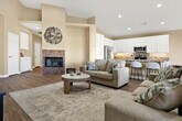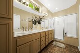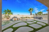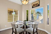 This seasonal rental is crisp & clean and a welcoming home to enjoy the weather in paradise! The view of the mountains in the morning sun is breath taking from the relaxing patio overlooking the free form pool. The beautiful wood patterned ceramic neutral color tile floors throughout are easy care and compliment the open floor plan. The kitchen with stainless appliances includes a gas range,granite slab counter tops opening to the living and dining areas; where all can all see the large 55'' television over the cozy fireplace. The spacious primary suite with king bed,TV and oversized closet with organizers offers ample space for your vacation attire & storage. The convenient attached bathroom has dual vanities and an enclosed shower. the first Guest suite has a queen bed and the second guest suite has twin beds. Both are located opposite side of the living area which offers guests privacy. A perfect lay out for golfers or family visitors. Individual laundry room with utility sink for easy clean up. Kick back,relax & ENJOY the best of the Desert weather. The oversized community pool & Fitness Center are located at the end of the street,for the serious swimmer or just sun bathing in a resort like setting. offering a oversized pool for the lap swimmer.