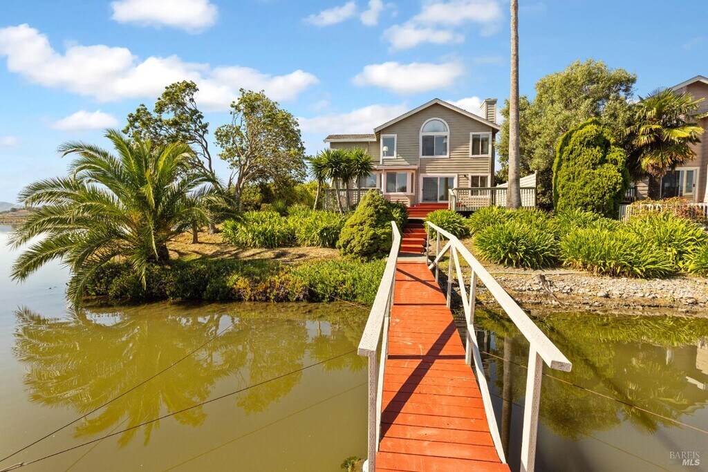 Year-round vacation living right outside your door! Ideally located at the end of the cul-de-sac with wide open water views in the coveted neighborhood of Bel Marin Keys. Privacy with only one neighbor on the left side. This Air Conditioned 4bd/3ba floor plan features a convenient main-level bedroom and full bathroom, with three additional bedrooms and two full baths upstairs plus an additional loft/office. The formal living and dining areas boast vaulted ceilings and oversized windows that flood the home with natural light. A spacious kitchen with stainless steel appliances and sunny breakfast nook opens to a generous family room with a cozy fireplace - perfect for gatherings. Step outside to your private deck, lawn and garden. Your own boat dock invites you to swim, paddle board, kayak, or cruise; water activities become part of daily life. The spacious garage offers ample storage areas for your gear and water toys. Year-round waterfront living at it's finest! Main level bedroom and full bathroom, Primary suite has a huge walk in closet, full sized jacuzzi tub with privacy and a fantastic view. All of the bathrooms have been remodeled. There is spacious deck off the kitchen/family room. MLS#325103005