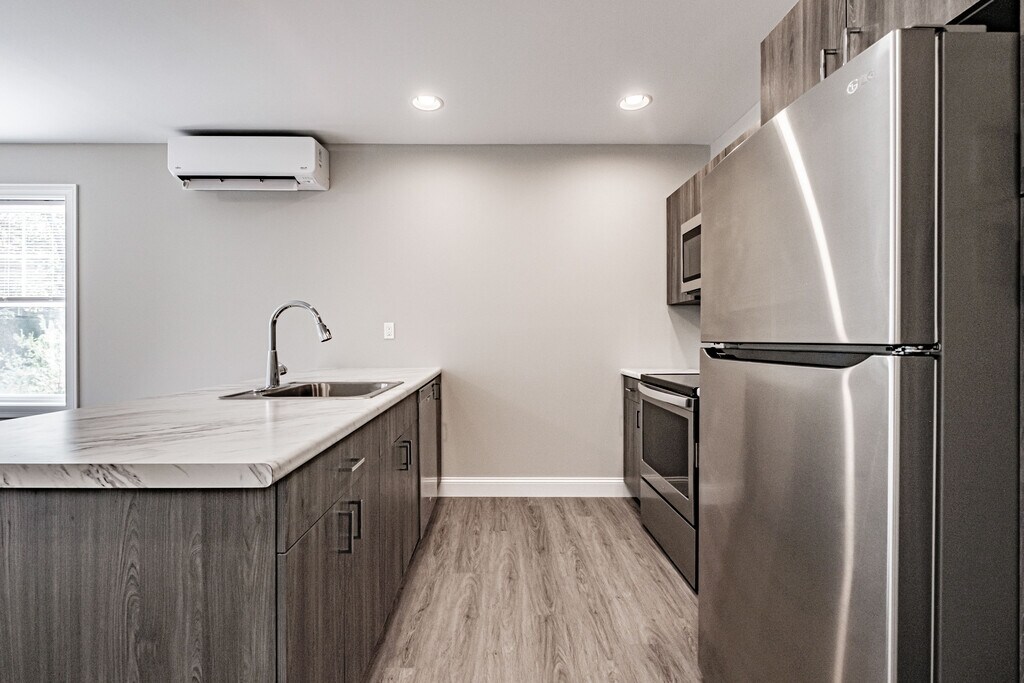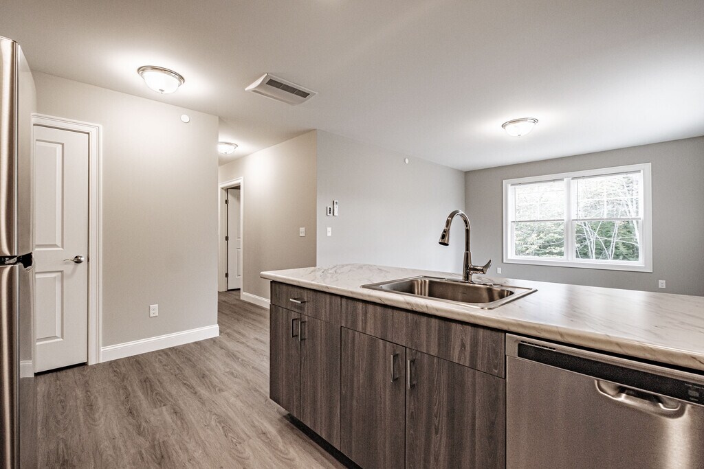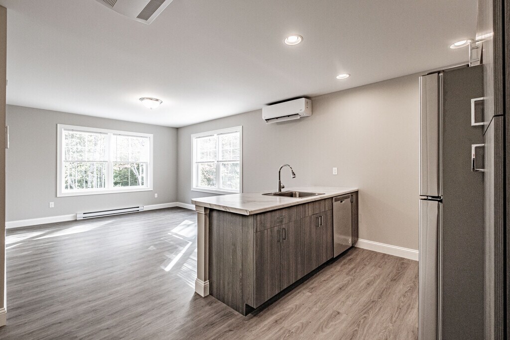 Overview Welcome to this energy-efficient 2-bedroom, 1-bath apartment at Lakewood and Lakewood Commons in Bridgton, ME. Built by Maine Eco Homes (MEH) and offering 843 sq ft of modern living space, this thoughtfully designed apartment combines contemporary finishes with low-maintenance comfort. Located just off Route 302, the property provides a peaceful wooded setting with easy access to local services and outdoor recreation.Interior Highlights Step into an open concept living area featuring wood-style flooring throughout, recessed lighting, and a privacy control wall and ceiling design that enhances quiet and comfort. Central air and central heating keep the apartment comfortable year-round, while ceiling fans and energy-efficient fixtures add to the modern build. The bathroom showcases ceramic tile and a walk-in shower with a built-in seat for convenience and accessibility.Kitchen & Appliances The fully equipped kitchen is a focal point, highlighted by stainless steel appliances, a dishwasher, microwave, oven/range, refrigerator, and a kitchen peninsula countertop that makes meal prep and casual dining easy. The unit is cable-ready and offers high-speed internet availability for remote work and streaming.Bedroom & Storage Two well-proportioned bedrooms include spacious closets and ceiling fans for comfort. The layout balances private sleeping areas with an open living space, making it ideal for a roommate setup, a couple, or anyone seeking extra storage and organized living. Extra optional storage available within the community (fee based).Laundry & Convenience Enjoy the convenience of in-unit washer and dryer facilities and dedicated private lot parking. The apartment’s low-maintenance design and modern systems simplify daily life so you can spend more time enjoying Bridgton’s outdoor offerings.Outdoor & Community Amenities The community includes a park, nature trail, yard space, BBQ areas, and fire pits—perfect for seasonal gatherings and outdoor relaxation. Soleful Health Club a short walk to the community offering discounted gym membership to residents. Electric car charging station on campus offering car charging convience. The private wooded location provides natural buffer while remaining minutes from Route 302 for commuting and shopping.Pet Policy & Practical Details Pets are allowed with management approval, and one-year leases are required. Rent is $1,595 per month with a matching security deposit of $1,595. The unit is available beginning May 1, 2026. A $80 application fee applies; first month’s rent and security deposit are due at lease signing. All applicants are subject to credit and background checks.Why You’ll Love It This apartment blends modern finishes, energy-efficient systems, and community amenities in a serene Bridgton location. Whether you’re drawn to the stainless steel kitchen, in-unit laundry, or the nearby nature trail, community park, and Soleful Health Club, this home offers comfort and convenience for modern renters seeking quality and value.
