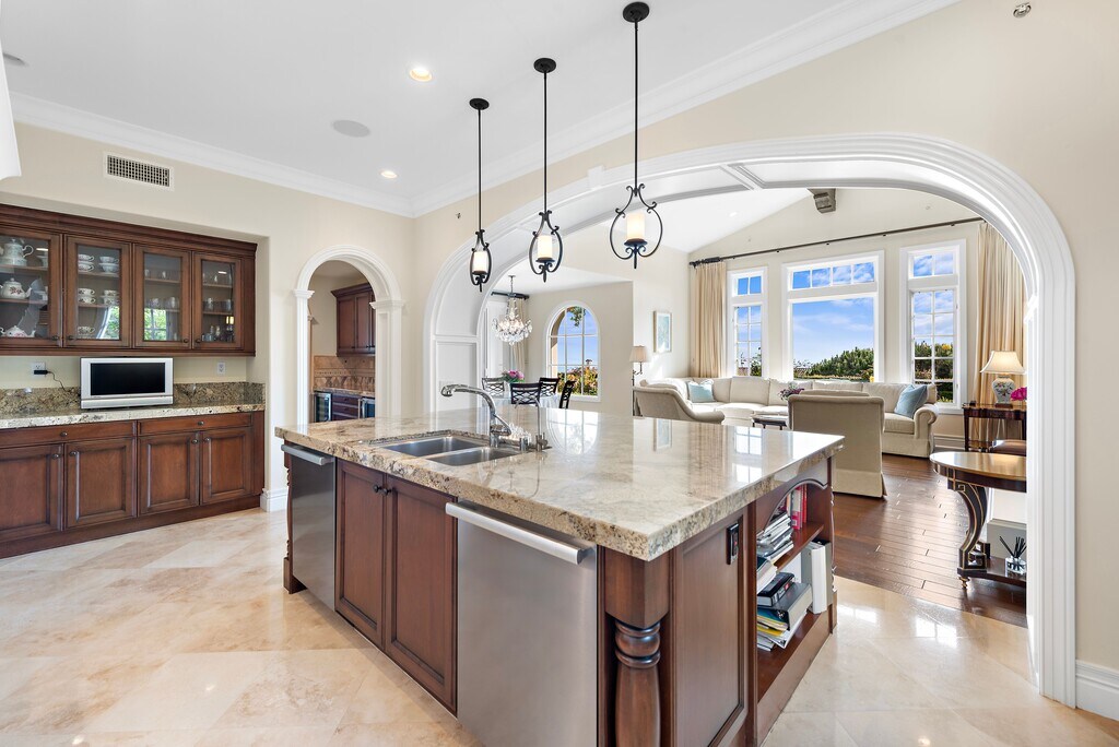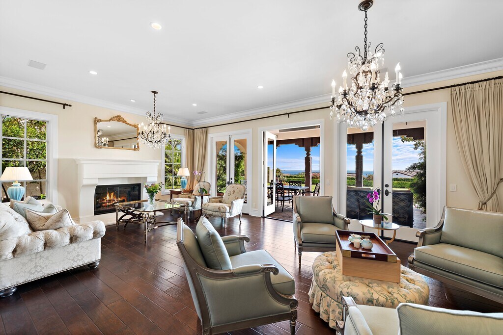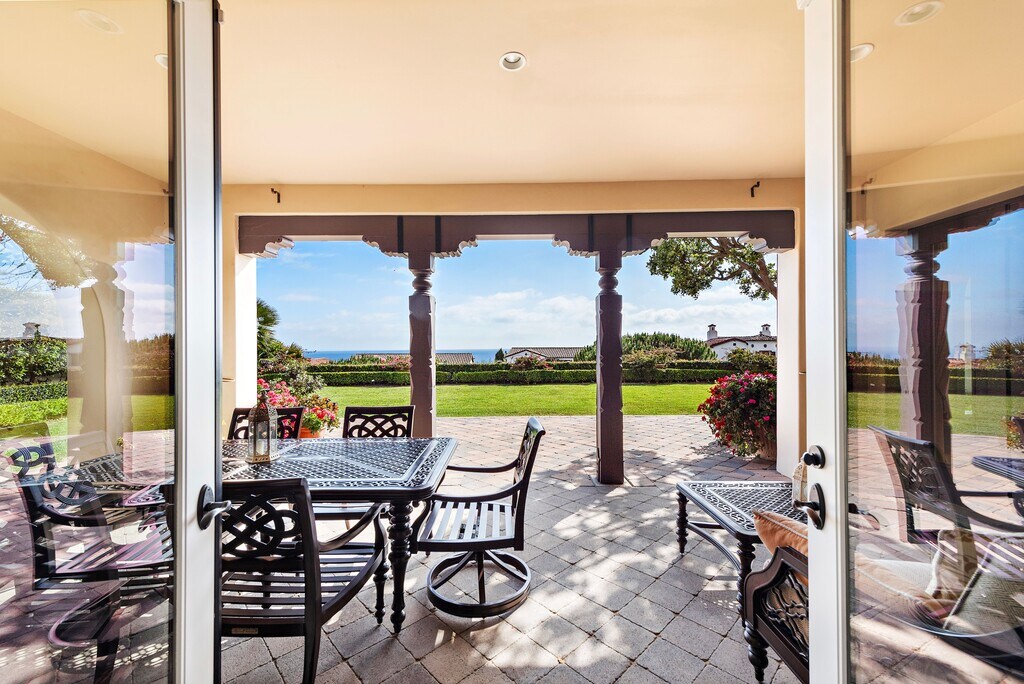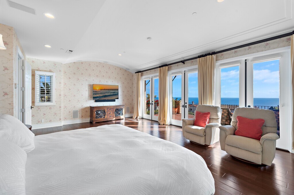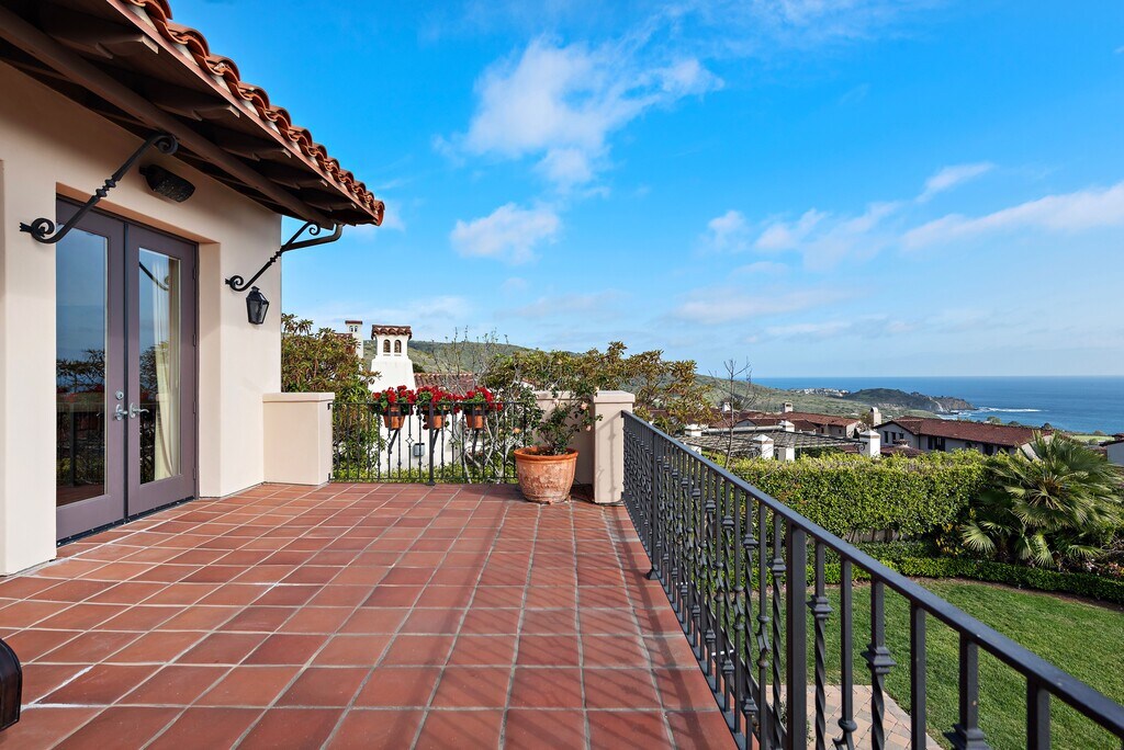 Perched above the Pacific in Newport Coast’s prestigious Crystal Cove, this Mediterranean-inspired estate offers sweeping views of Catalina Island, El Morro Cove, and Abalone Point. Set on an expansive 11,077 (+/-) sq ft lot, the home spans 5,082 (+/-) sq ft of refined living space designed to embrace coastal beauty at every turn. Beyond a private gated courtyard, the residence welcomes you with wood-beamed ceilings, distressed walnut floors, and European tile floors, blending timeless elegance with relaxed sophistication. The formal living room features a precast fireplace, custom crystal chandeliers, and opens to a heated, covered loggia—perfect for enjoying ocean sunsets year-round. The chef’s kitchen is fully equipped with top-tier appliances, granite countertops, two dishwashers, a prep island, and a separate catering kitchen. An open-concept layout connects seamlessly to the family room and breakfast nook, all framed by panoramic ocean views. The primary suite is a peaceful retreat with French doors opening to a stunning, private ocean view terrace and a spa-inspired bath featuring a jetted tub, large walk-in shower, and dual walk-in closets. The thoughtful floor plan includes a dual-desk upstairs office and four bedrooms, five bathrooms, inclusive of a separate guest casita with private entrance—ideal for visitors or multigenerational living. Enjoy a manicured lawn with plenty of room for relaxation and recreation, a 3-car garage with built-in storage, a built-in audio system, and ADT Security installed on all doors and windows. Living in Crystal Cove means more than enjoying an extraordinary home—it’s access to a world-class lifestyle. Residents enjoy a heightened level of privacy, prestige, and 24-hour guard-gated security along with exclusive amenities at The Canyon Club, including a resort-style pool, spa, fitness center, and sport courts. Private beach access, miles of scenic trails, and proximity to Laguna Beach, Newport Beach, and upscale shopping and dining at Fashion Island make this one of the most desirable communities on the California coast.