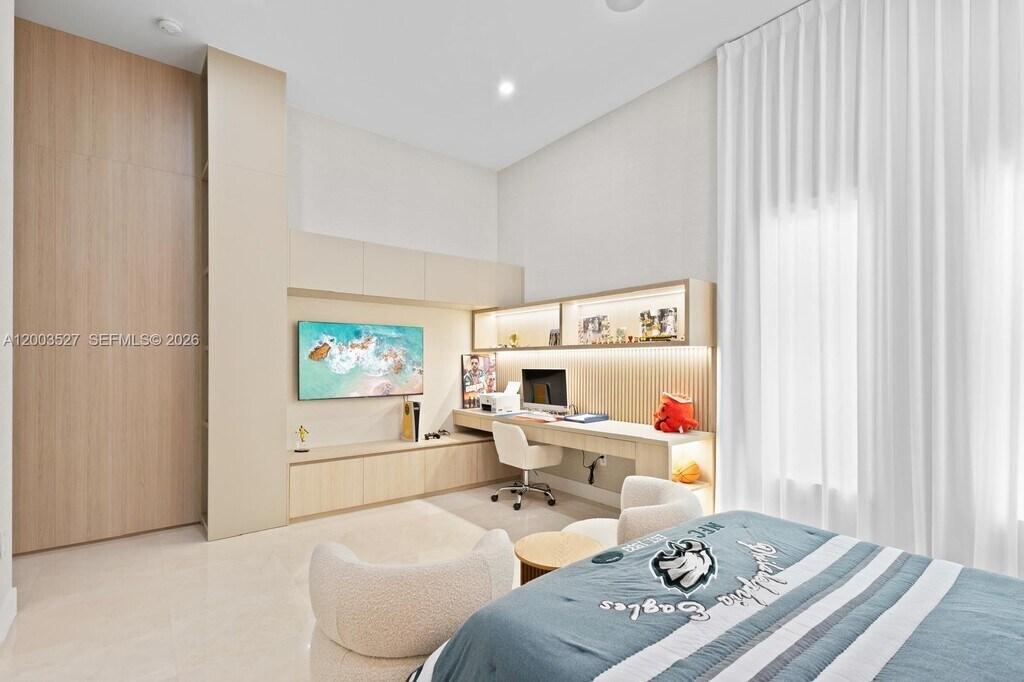 A modern masterpiece which sits on almost 1 acre featuring six spacious bedrooms each with their own in suite bathroom, including a luxurious primary with walk in closets, and spa like bath. Designer finishes, top tier appliances butler's pantry and private theatre. The home boasts soaring high 12-inch ceilings, sleek modern decor and an abundance of natural light and open living spaces. Over $500K in upgrades with uncompromising attention to detail. Outside there's a generous backyard resort style with a stunning pool, large spa, covered lounge, NBA style half basketball court, pickleball court, and not to forget its own private 1 bedroom 1 bathroom guest house. MLS # A12003527