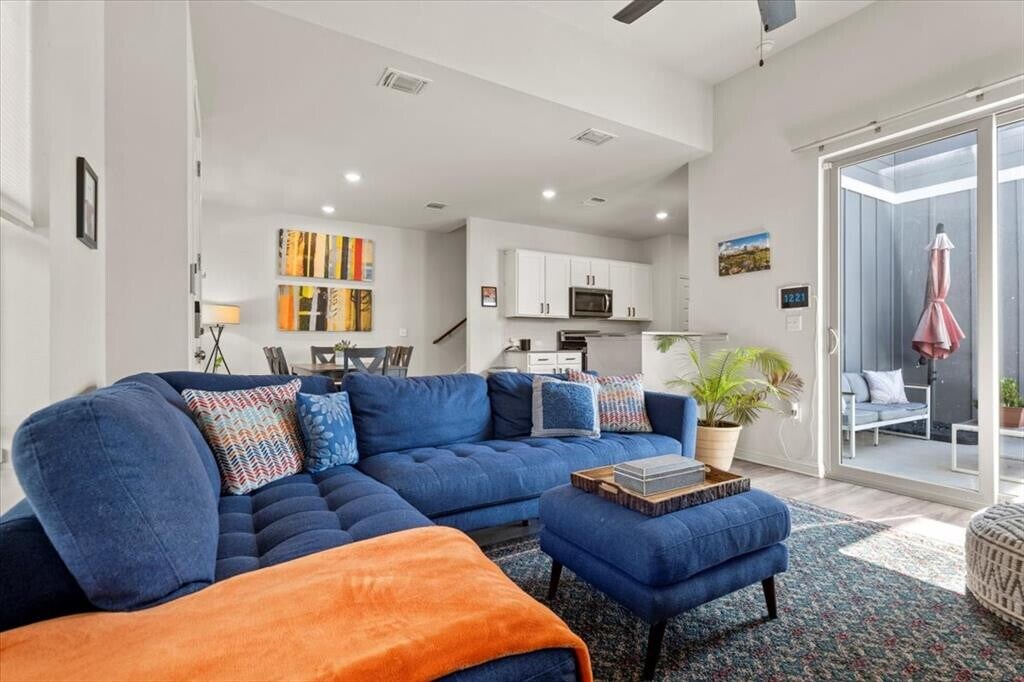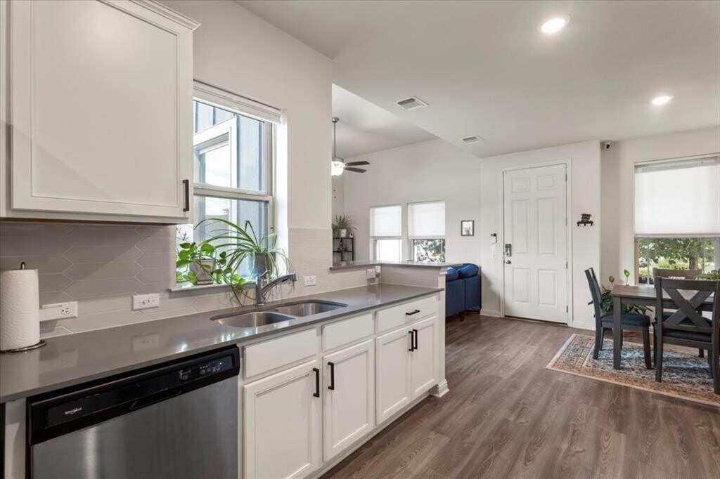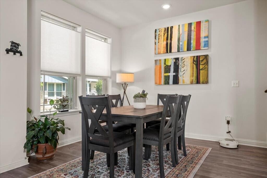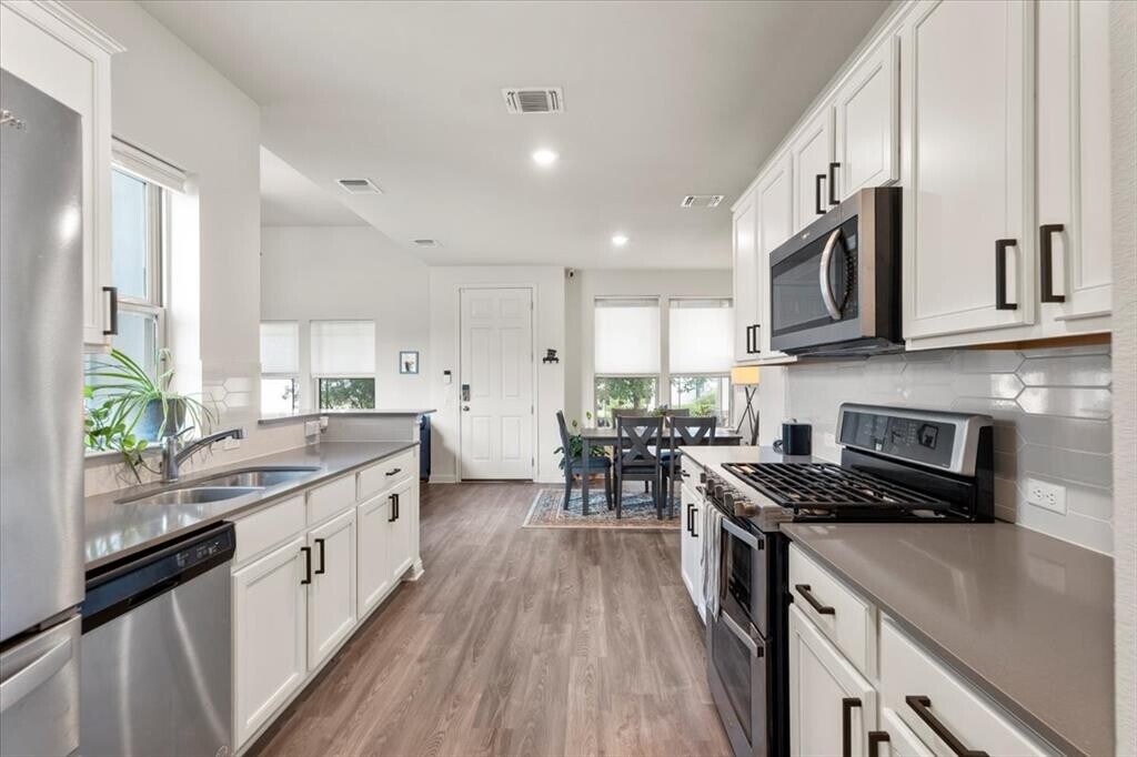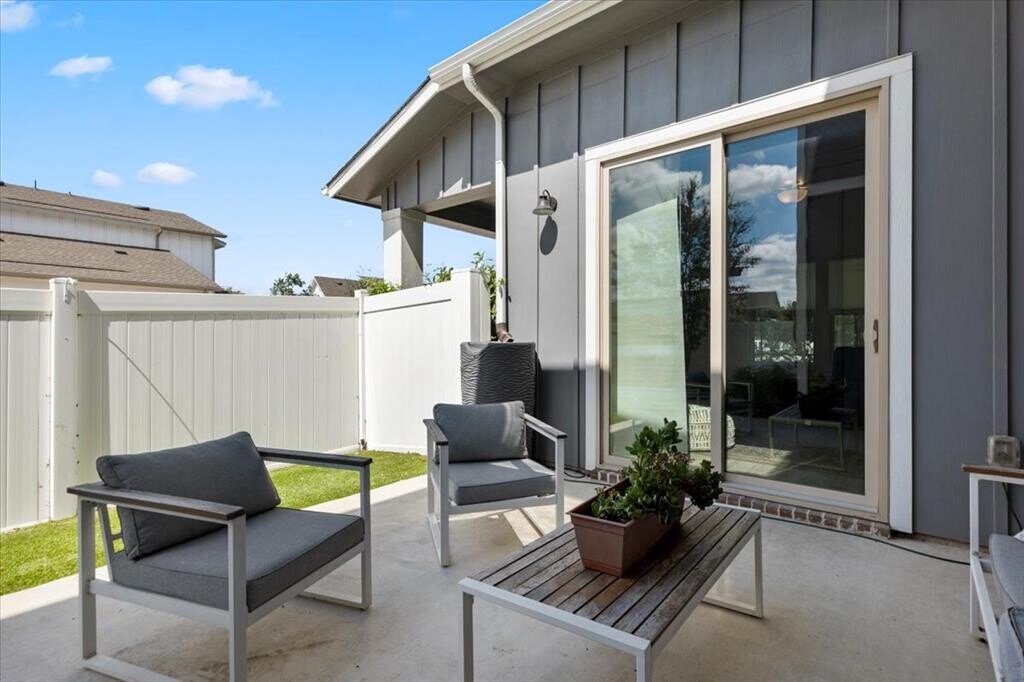 Located on a corner lot in the quiet Union Park East section of Easton Park, this home offers easy walkability to the dog park, The Treehouse foodtruck park, and The Union amenity center, featuring a full gym, two pools, and more. The spacious backyard space is low maintenance with turf and a raised garden bed plus an adorable private back porch. As you pull up to the home, the curb appeal is striking with a large wrap-around front porch facing a beautifully landscaped interior courtyard. Plenty of guest parking is located right outside, plus there's already a 240V plug in the garage for your EV charger. The inside of the home is spacious and bathed in natural light. A huge under-stairs closet located inside the powder bathroom offers tons of extra storage! Upstairs there is a spacious bonus room, plus two bedrooms and two full baths. Looking for comfort and style all in a convenient location within short driving distance to the airport and downtown? Look no further than 8000 Mellencamp! Refrigerator, washer, and dryer included.