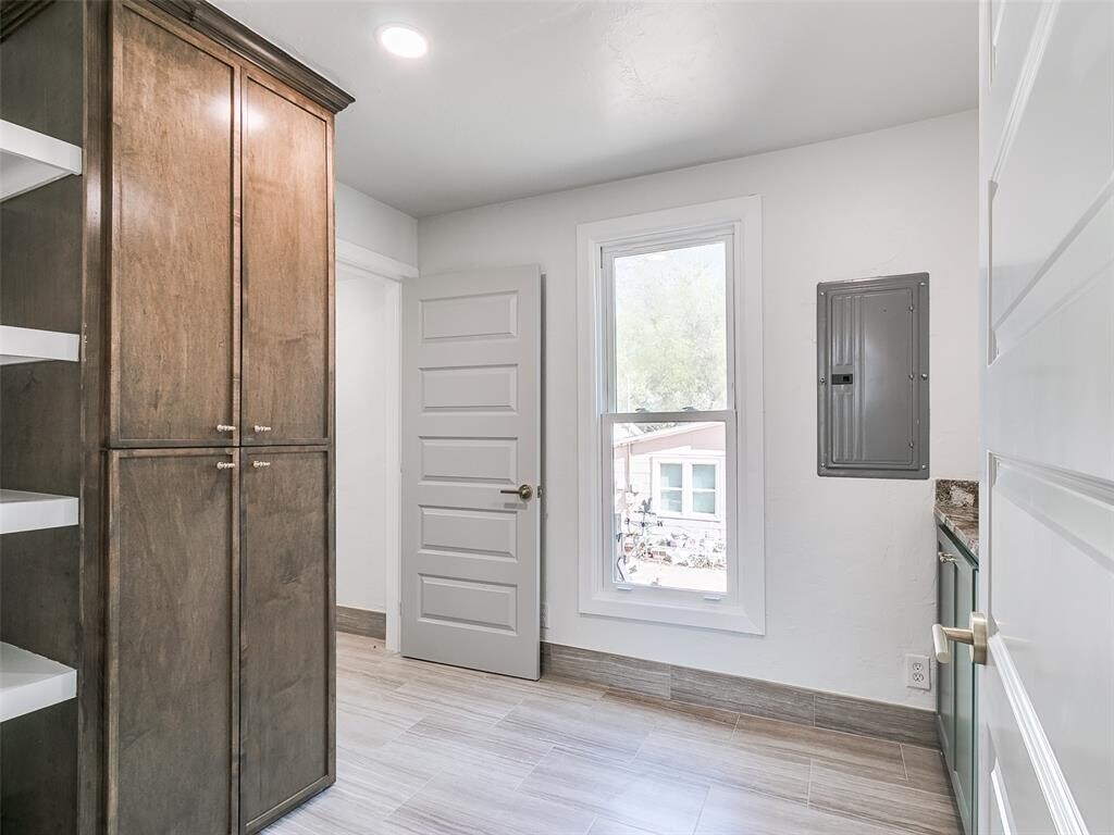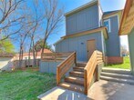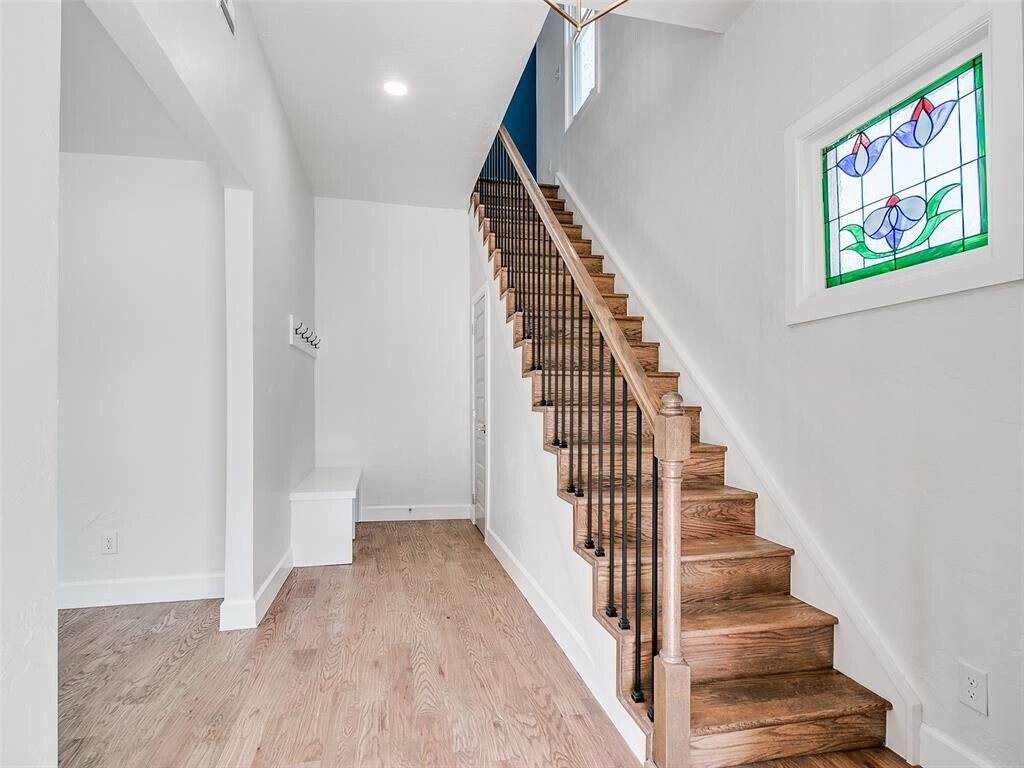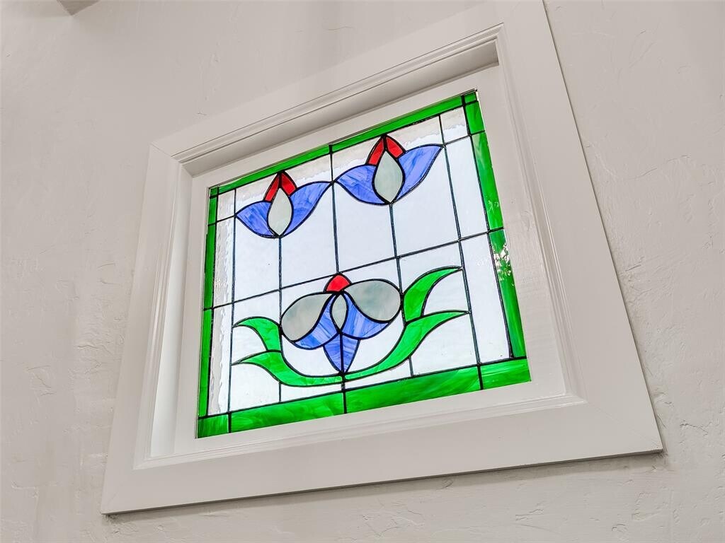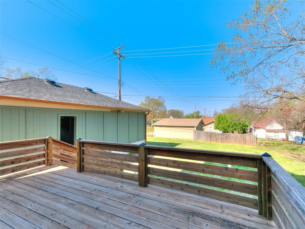 Nestled in a neighborhood of historic homes and mature trees,this home has been renovated with modern conveniences while retaining its classic Oklahoma charm. An ideal corner lot location,the home is 5 blocks north of Noble Street/downtown Guthrie,and just 2 blocks from Fogarty Elementary School. When stepping through the front door,you are greeted by remastered hardwood floors,stained glass,and wrought iron railing stairs. Large windows allow for an abundance of sunlight to fill the living and dining room areas. Off the dining room is a full walk-in pantry with cabinet storage and counter space that leads you to a half bath and laundry room area. The kitchen has been updated and features ceiling height cabinets,quartz countertops,tiled backsplash,ceramic sink,and recently replaced appliances. Upstairs you will find the remodeled full bath that boasts a large glass-walled tile shower with seating bench,primary bedroom with painted accent walls and a writing nook with built-in desk,and secondary bedroom with attached flex room. The flex room could be a 3rd bedroom. At the back of the home is a sizable deck to take in the serene surroundings and a detached 2 car garage.