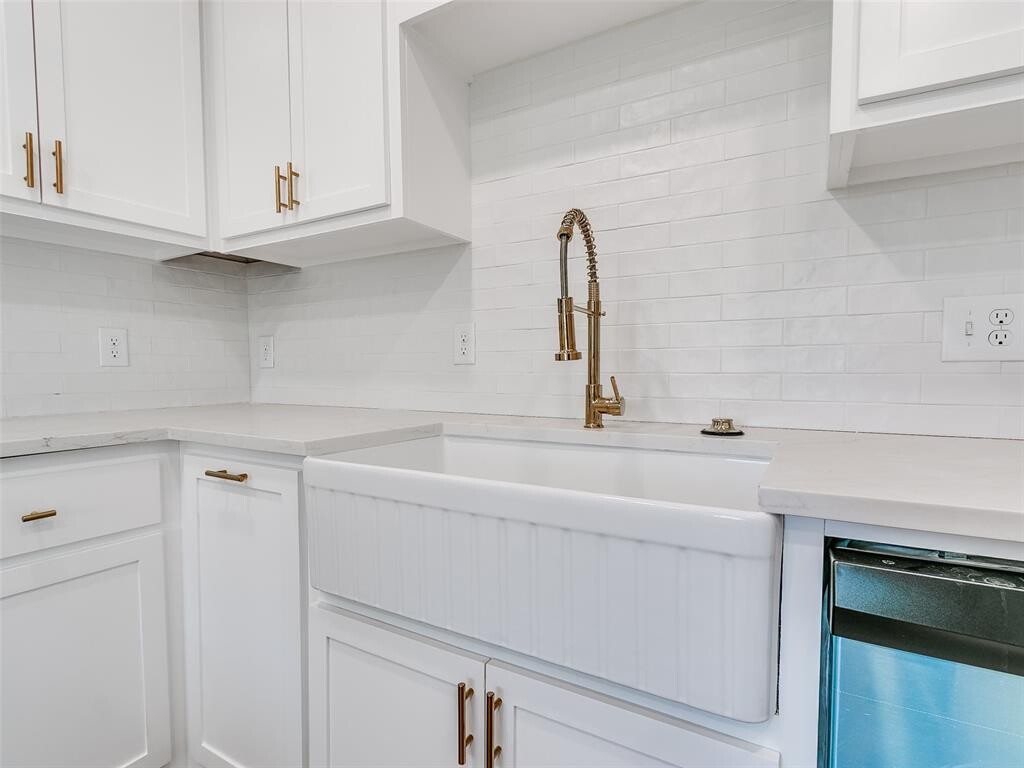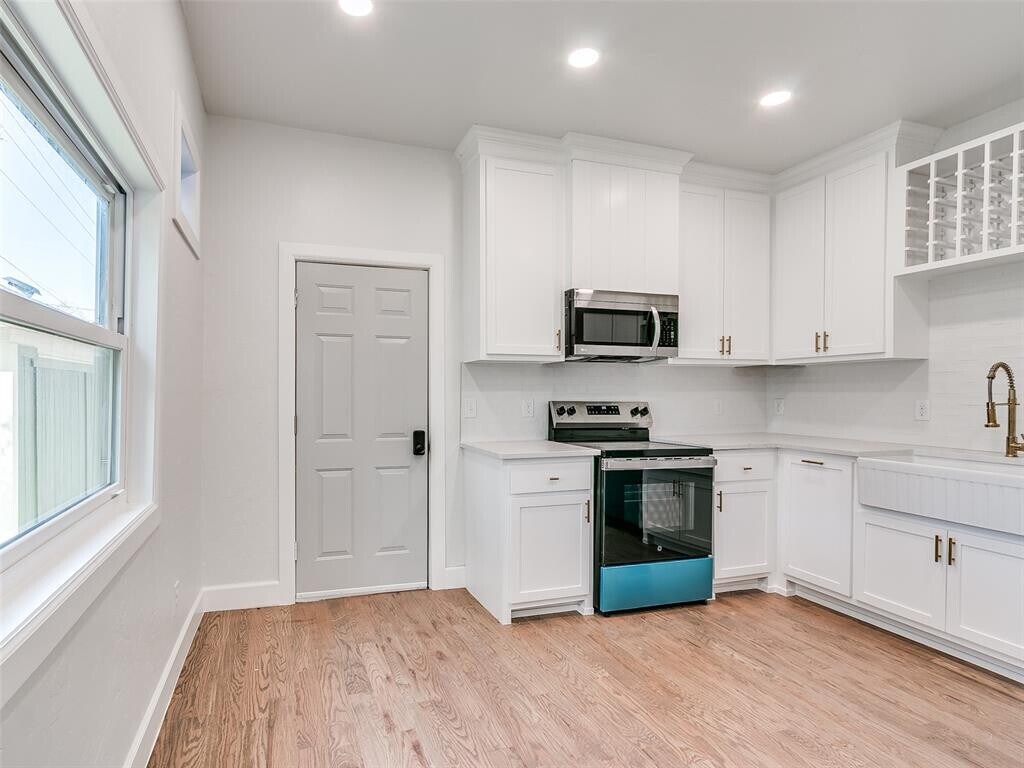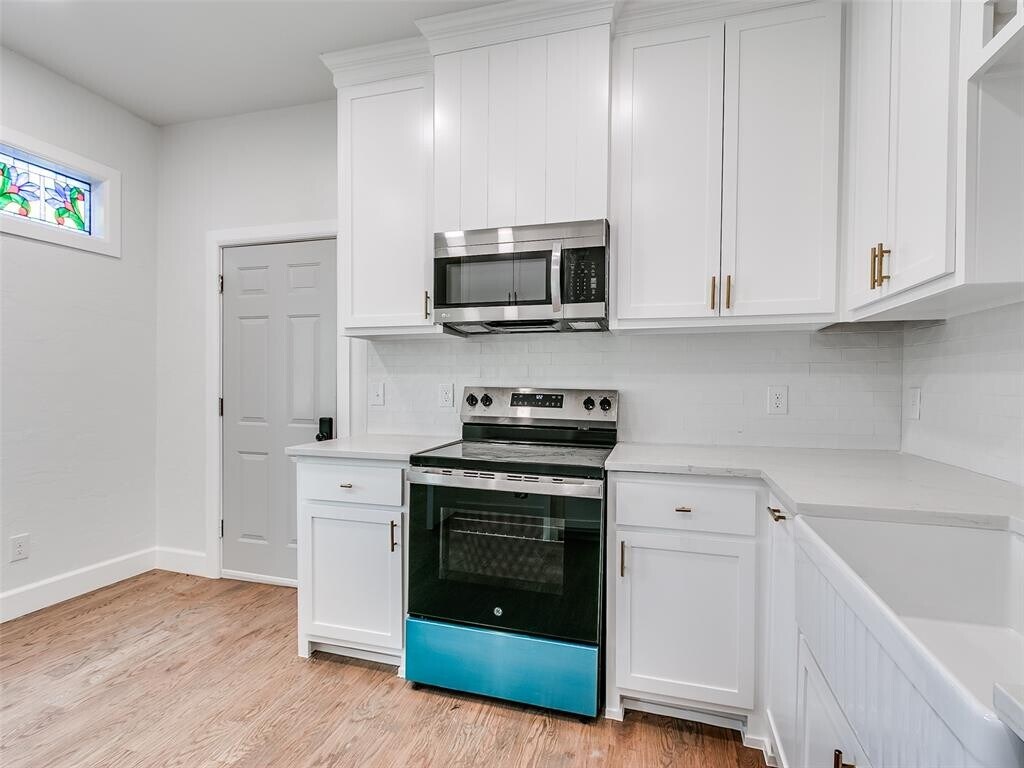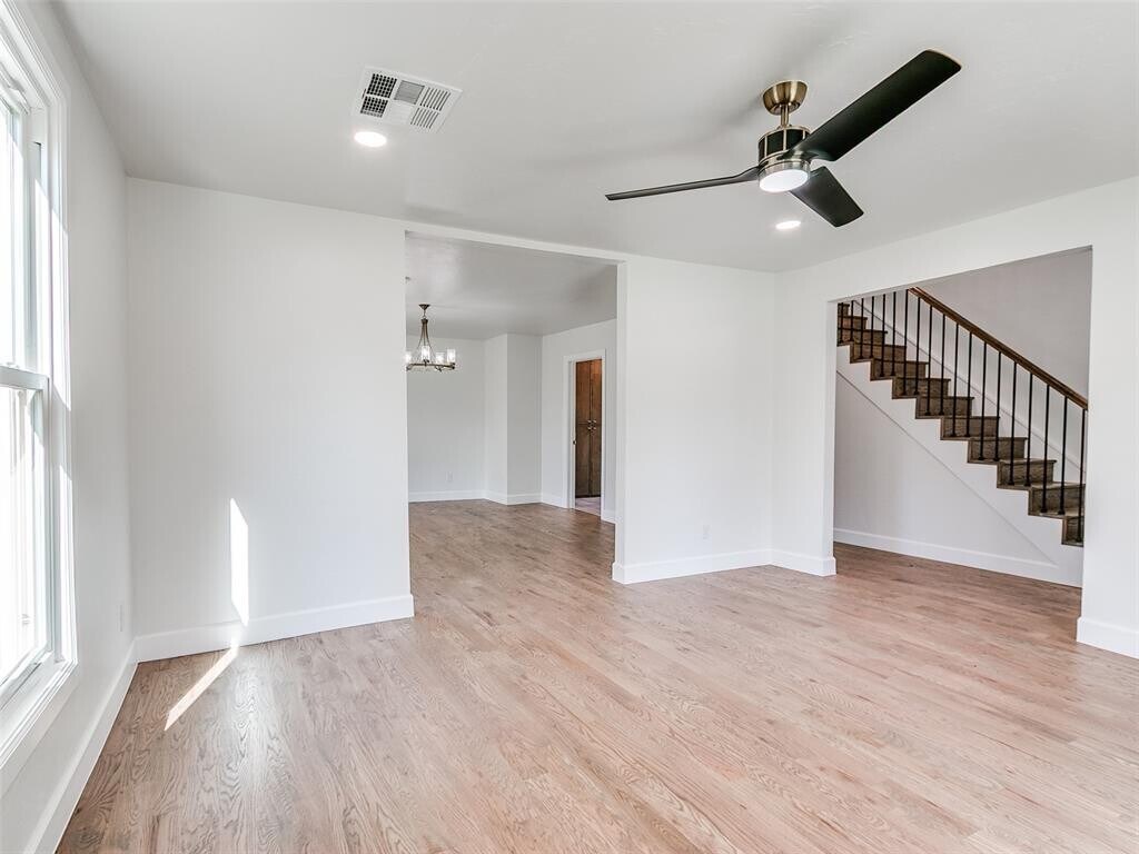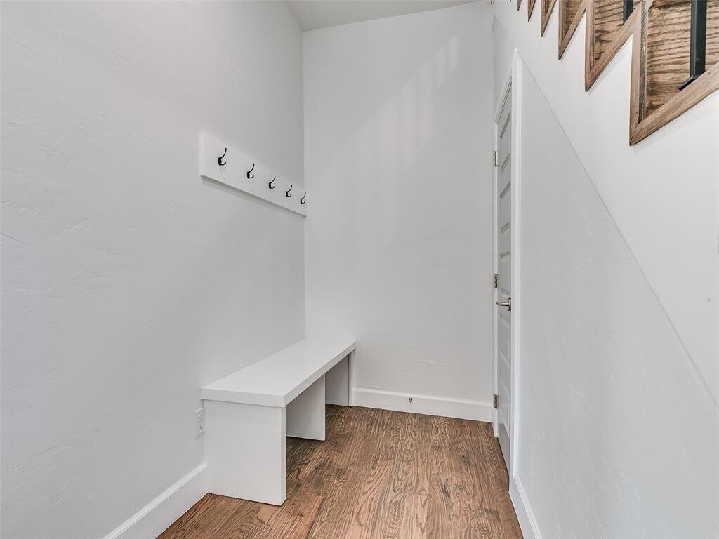 Nestled in a neighborhood of historic homes and mature trees,this home has been renovated with modern conveniences while retaining its classic Oklahoma charm. An ideal corner lot location,the home is 5 blocks north of Noble Street/downtown Guthrie,and just 2 blocks from Fogarty Elementary School. When stepping through the front door,you are greeted by remastered hardwood floors,stained glass,and wrought iron railing stairs. Large windows allow for an abundance of sunlight to fill the living and dining room areas. Off the dining room is a full walk-in pantry with cabinet storage and counter space that leads you to a half bath and laundry room area. The kitchen has been updated and features ceiling height cabinets,quartz countertops,tiled backsplash,ceramic sink,and recently replaced appliances. Upstairs you will find the remodeled full bath that boasts a large glass-walled tile shower with seating bench,primary bedroom with painted accent walls and a writing nook with built-in desk,and secondary bedroom with attached flex room. The flex room could be a 3rd bedroom. At the back of the home is a sizable deck to take in the serene surroundings and a detached 2 car garage.