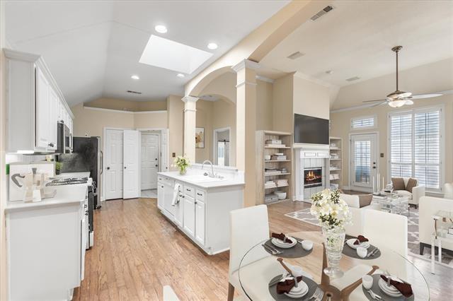 ONE-STORY HOME WITH UTILITIES INCLUDED! This beautifully maintained single-story residence offers a thoughtfully designed floorplan in a prime location. The manicured landscaping and inviting drive-up set the stage for a home that combines comfort and style. Inside, engineered wood floors extend throughout most of the home, complemented by plantation shutters and upgraded decorative lighting fixtures that add elegance to every room. Natural light fills the space through a skylight in the eat-in kitchen, which features a large pantry and flows seamlessly into the open family room—perfect for entertaining or relaxed daily living. A decorative barn door adds a modern touch to the master suite, which includes dual sinks, a separate soaking tub, a glass-enclosed shower, and a generously sized closet. The home comes equipped with a refrigerator, and utilities—including gas, electric, water, trash, and sewage—are included in the rent (ask agent for details). Lawn maintenance is the tenant’s responsibility. This residence effortlessly blends modern finishes, functional living spaces, and convenience, offering a stylish and move-in-ready home with everything you need for comfortable single-story living.