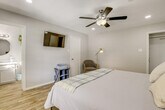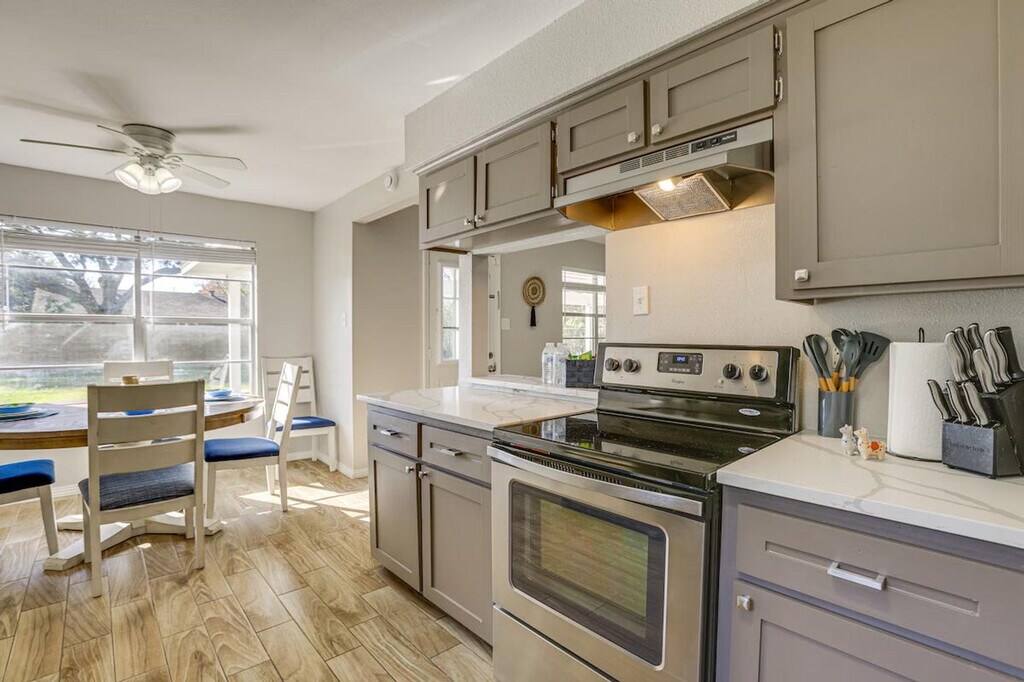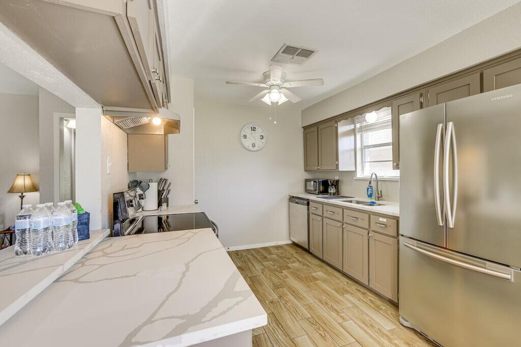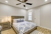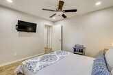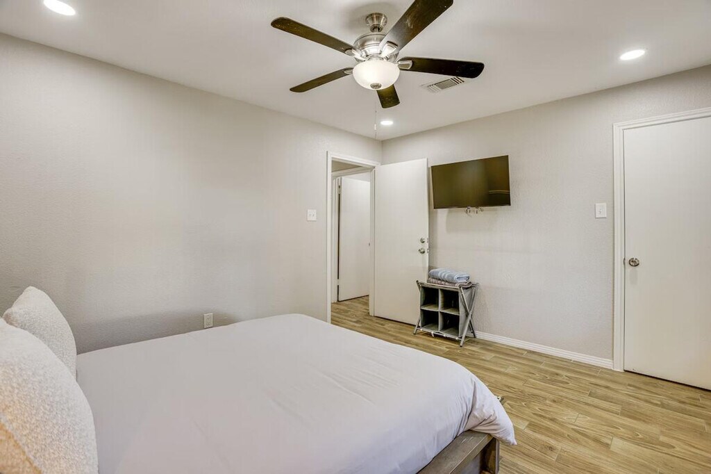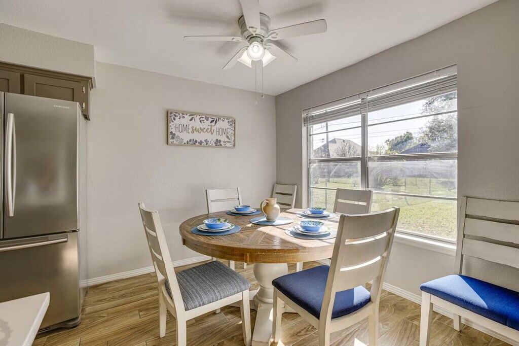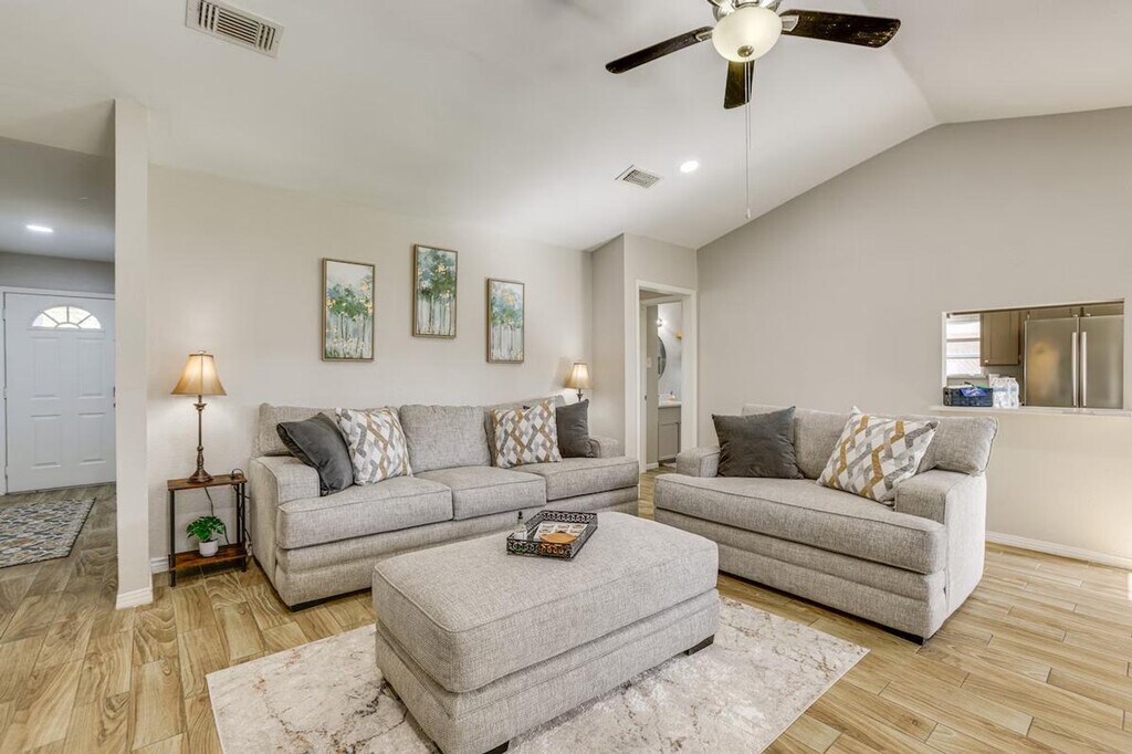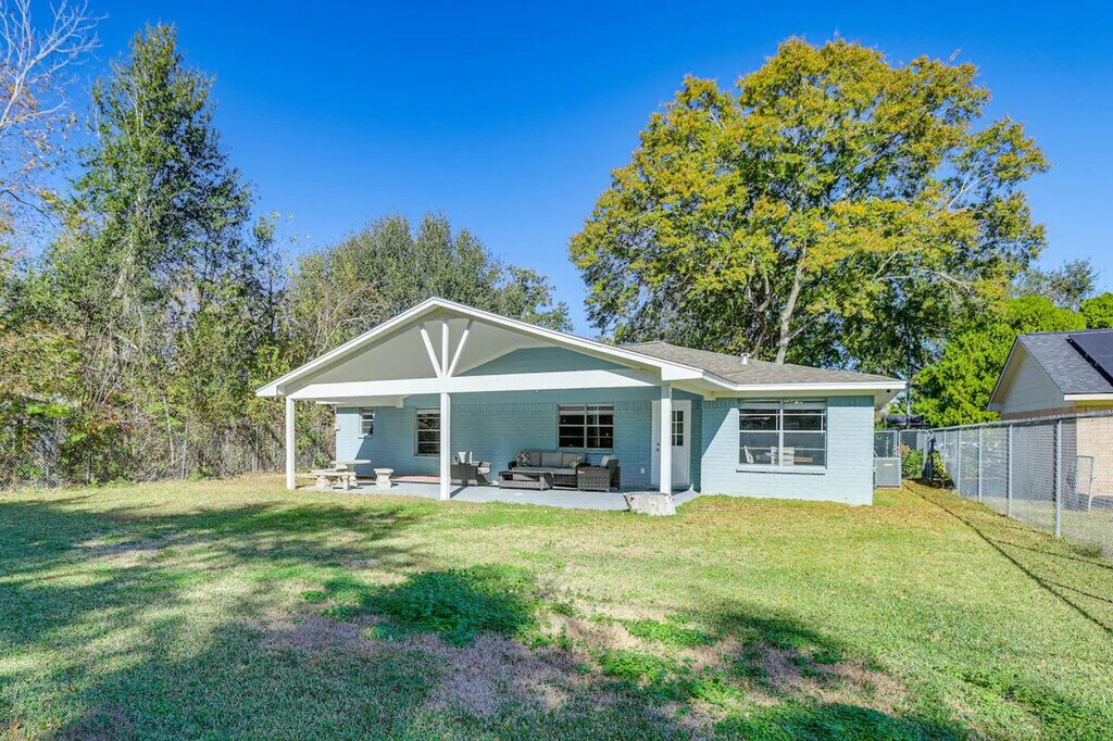Feel at home in this modern and spacious 3-bedroom, 2-bath home, your gateway to Greater Houston. This single-story home requires one step to enter. This family friendly vacation rental features smart TVs, an electric fireplace, a dining area, and board games. The eat-in kitchen is equipped with a refrigerator, stove/oven, dishwasher, microwave, blender, toaster, Keurig coffee maker with starter coffee pods, cooking basics, dishware, and flatware. Additional amenities include free Wi-Fi, central air conditioning and heat, ceiling fans, towels and linens, complimentary toiletries, a hair dryer, a washer and dryer with starter laundry detergent, an iron and board, hangers, and keyless entry. Guests have access to the entire property via keyless entry. Located just outside the loop and within 3 miles of Hobby Airport, this home offers unbeatable access to the area, including world-class shopping and dining and outdoor fun in Clear Lake and Trinity Bay. Enjoy the fenced backyard and furnished covered patio. No events, parties, or large gatherings are allowed. Pets are not allowed. There are four exterior security cameras: one Ring doorbell device at the front door monitoring the entrance area, one camera on the back of the house facing the patio, and two cameras on the front of the garage facing the driveway and street. The cameras are outward facing and record video and sound when activated by motion. [SI]