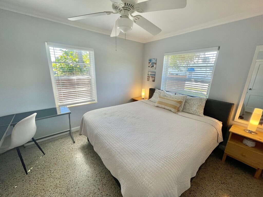 Charming 2BR/1BA fully fenced and furnished Florida cottage with a sunroom, just 1 mile from the beach and ideally located near the French Bakery, directly across from the Sail Inn and surrounded by cute local shops and cafes.