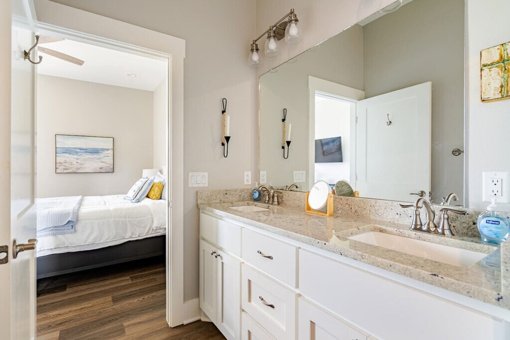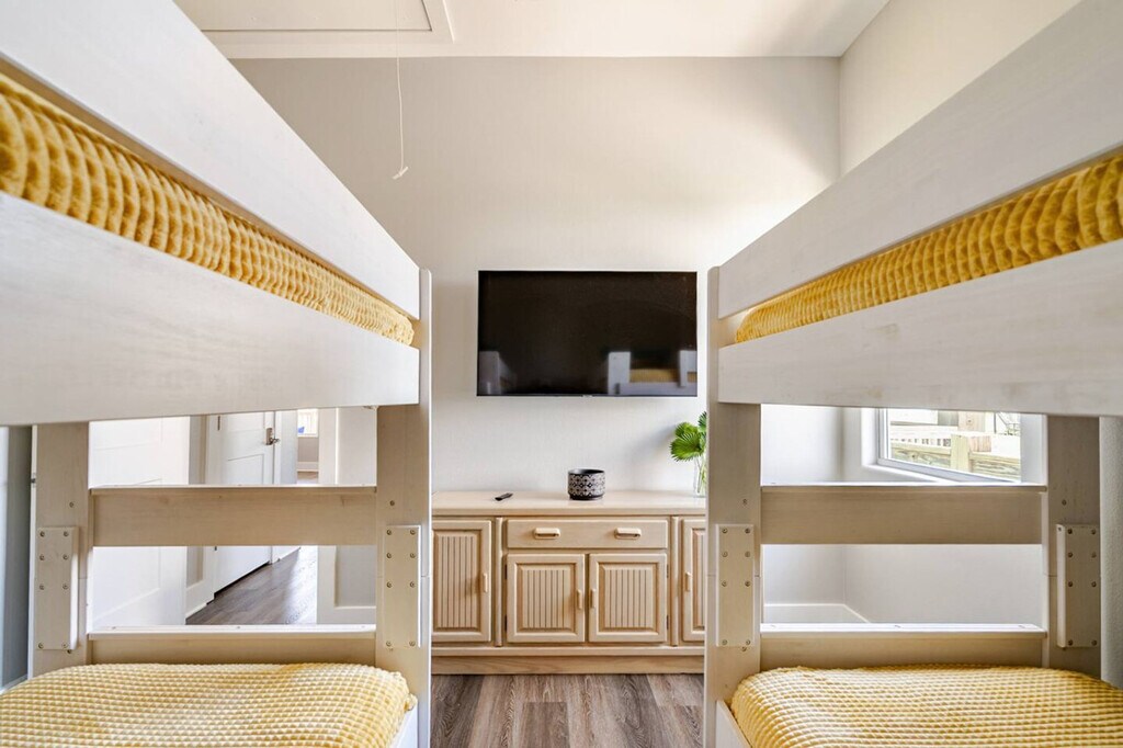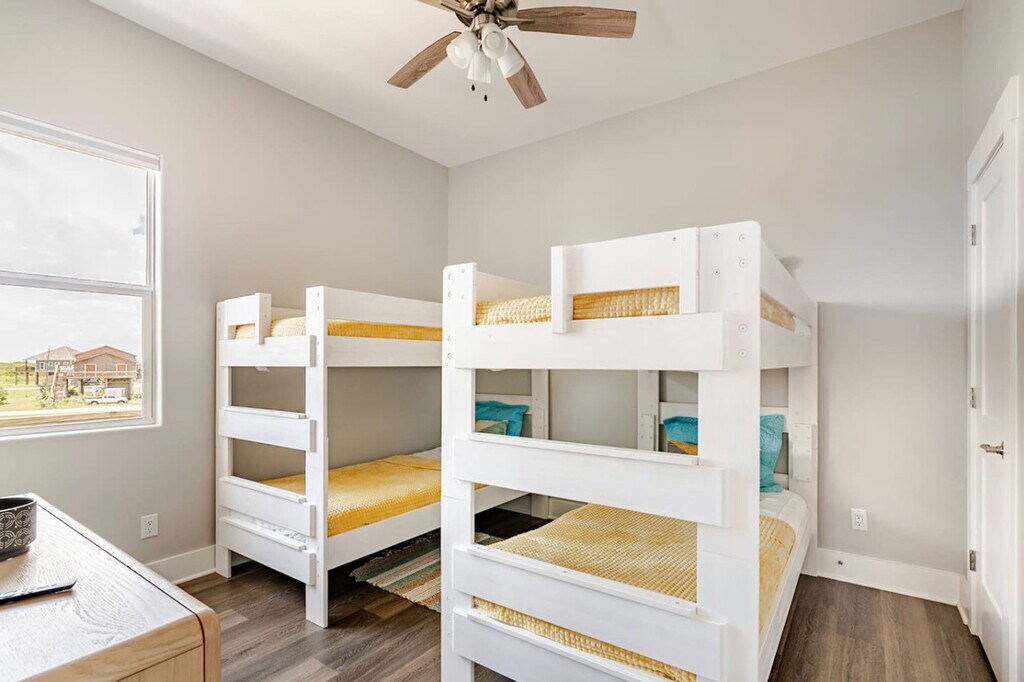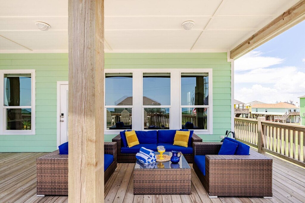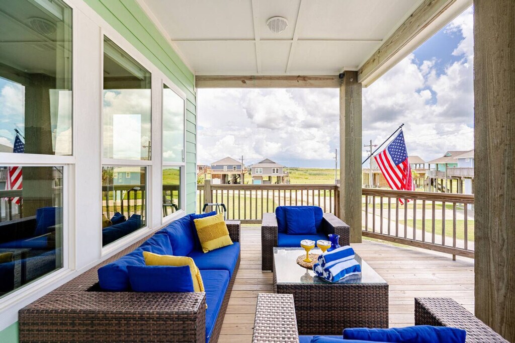 Watch ships pass by and enjoy sunrise and sunset from the deck at Lost Salt Surf Shack, just steps from the beach. This inviting home features three bedrooms: a king, a queen, and a room with two twin-over-twin bunks. The spacious living room and fully stocked kitchen make it easy to relax or cook meals. Enjoy the top deck with great views and seating, unwind on the downstairs patio, and find more games, seating, and a firepit in the garage—perfect for evenings together. You’ll have access to the entire house during your stay, except for any locked closets reserved for owner storage and cleaning supplies. All other spaces—including bedrooms, living areas, kitchen, patios, and garage—are yours to enjoy. Nestled at the western edge of the Bolivar Peninsula, Port Bolivar is a laid-back coastal community just a short and free ferry ride away from Galveston Island. It features wide open beaches, picturesque Gulf views, and sandy shorelines ideal for beachcombing, birding, or casual outings with family and friends. Nearby you’ll find scenic parks like Fort Travis Seashore Park, historic sites, local seafood spots, and easy public access to beaches and marshland trails. Getting around Port Bolivar is easy and laid-back. Most guests drive, and there’s plenty of parking at the house. You’re just a quick walk or drive from the beach—golf carts are popular here and are allowed both in the neighborhood and right on the beach. Local shops, restaurants, and the ferry to Galveston are all a short drive away, so you’ll have everything you need within easy reach. There are three security cameras, one monitors the bottom patio, one overlooks the top deck, and the other points towards the beach. Maximum occupancy is 8 people. Any additional people must be pre-approved prior to final reservation. Only registered guests are allowed at the house. Do not park under the house, park only on the driveway. Absolutely no smoking and no parties or events. Keep noise to a minimum during nighttime hours. Grills need to stay downstairs only. Grilling on the deck is prohibited and against Galveston County ordinance. Please clean the grill after use. If you go to the beach, please rinse sand off in the shower under the house. Leave your sandy shoes on the deck by the front door. Do not flush feminine hygiene products or anything other than what is expected to be flushed down the toilet, it will damage the septic system. Do not pour grease down the drains. Please lock doors upon departure and return the key to the lockbox. If guests are asked to leave due to irresponsible and bad behavior, no refund will be given for lost days. The beaches at Crystal Beach have no lifeguards on duty. Swimming is at visitor’s own risk. Please keep in mind that this is our home and we ask that you respect it as we would respect yours. [SI]