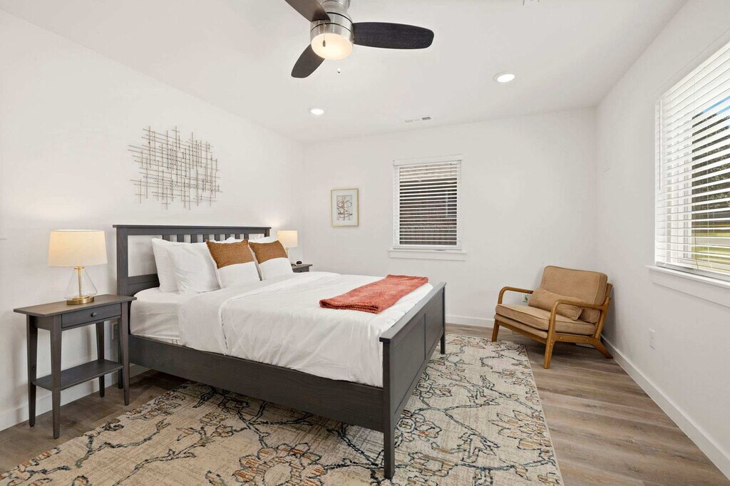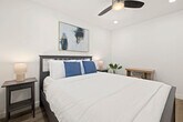 Easily explore everything Bentonville has to offer with this charming home located just steps from Bentonville Square, The Momentary, Crystal Bridges, and the Razorback Greenway, Northwest Arkansas' premier biking, running, and walking path. Perfect for mountain biking enthusiasts, the home is equipped with bike racks and a wash station, making it an ideal base for exploring Bentonville's extensive MTB trails. This inviting home features an open concept living, kitchen, and dining area, perfect for memorable gatherings. The living room offers plush seating and a large Smart TV with all your favorite streaming channels. The fully equipped kitchen is ready for you to prepare delicious meals, while the dining table is perfect for enjoying a board game or a meal. The home includes two private queen bedrooms, each with a desk, vanity, closet, and nearby bathroom. Spend time outside in the private backyard with a grill and outdoor seating, and take advantage of the bike wash station and racks. This pet-friendly home allows dogs, with a maximum of three, for a fee of $90 per dog. Unauthorized pets will incur a fine of $400. Enjoy the convenience of a washer and dryer available for guest use. Bentonville is renowned for its premier mountain bike trails, vibrant restaurants, and fascinating museums. Whether you choose to walk, drive, or bike, you'll have easy access to all the amenities that downtown Bentonville has to offer. Check-in is any time after 3:00 PM. Parties or guest actions that result in disturbances, property damage, extensive extra cleaning, or smoking indoors will incur a fine of $1,000. This is a non-smoking home, and smoking indoors will result in a $1,000 fine plus the cost of any smoke remediation necessary. Unauthorized checkout delays will incur a fine of $100 per hour. Quiet hours are between 10:00 PM and 10:00 AM. [SI]