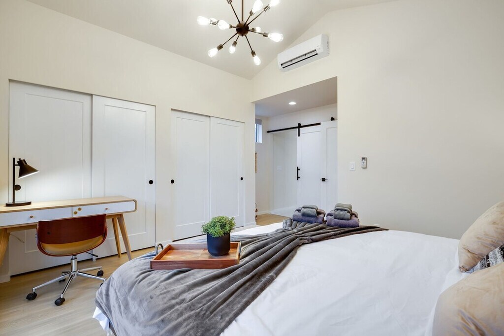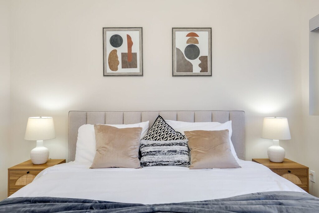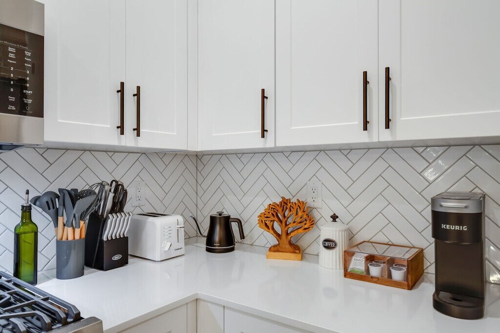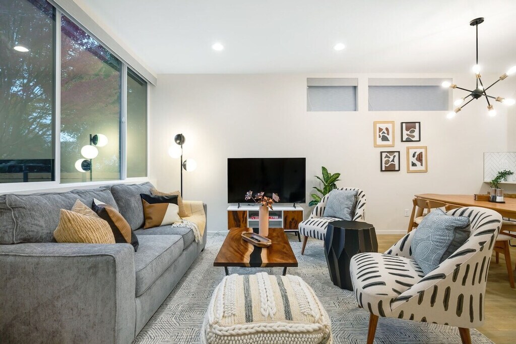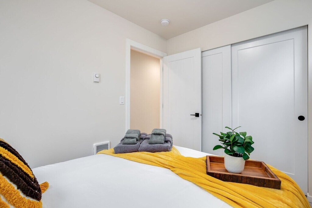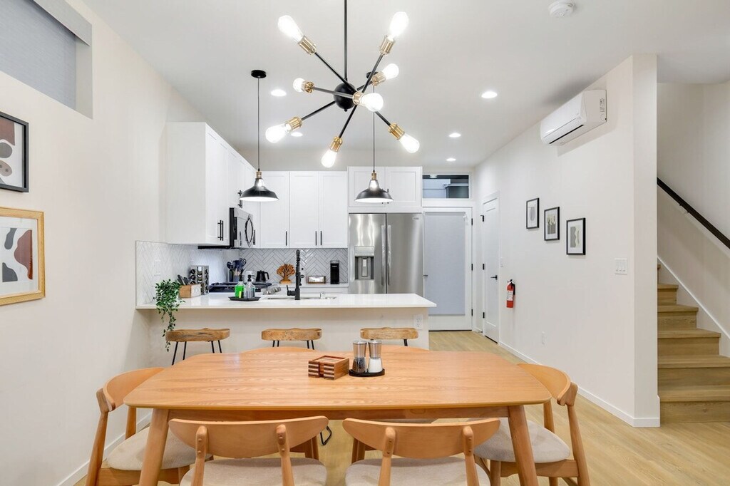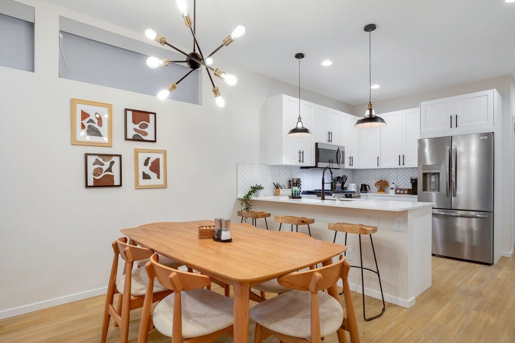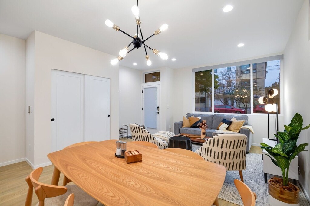 Feel at home in this tastefully decorated and spacious brand-new townhome in Ballard. This 4-story townhome offers 3 bedrooms and 2.5 bathrooms. The kitchen is stocked with high-end kitchen appliances, cookware, silverware, servingware, spices, Keurig coffee and tea. Enjoy high-quality beds, mattresses, pillows and linens for comfortable sleeping, and take advantage of the on-site washer and dryer for your laundry needs. The rooftop patio features comfortable outdoor furniture for an al fresco experience. Big windows provide lots of natural light, and blackout curtains are available for the bedrooms. A dedicated free parking spot with an EV outlet is available (bring your own charger). Centrally located in a safe, quiet neighborhood, this home is well-connected to other parts of the city, with walking distance to multiple bus options and easy access to Fremont, the University of Washington, and downtown Seattle. Walk to the bustling 15th Ave where there are lots of dining, shopping and grocery options. Ballard is a hip and trendy neighborhood northwest of downtown Seattle, with many bars, ice cream shops, tea and coffee parlors, and access to a lovely beach park at Golden Gardens. Ballard Ave is the key retail street, and if you stay here on Sundays, don't forget to check out the farmers market on Ballard Ave! This is not a pet-friendly home, and there is a $500 fine for unauthorized pets. Strictly no parties and events are allowed, and quiet hours are between 10pm-8am. No smoking or vaping of any kind is allowed anywhere on the property, including outdoor areas, and no digital piracy or shoes are allowed in the home. There is a $500 fine per violation. This is a townhome and is not handicap friendly, and guests have to be very comfortable with stairs as there are multiple stories. There is a camera at the front door and one at the back door, back facing the garbage bins. Registration Number: STR-OPLI-22-001626 [SI]
