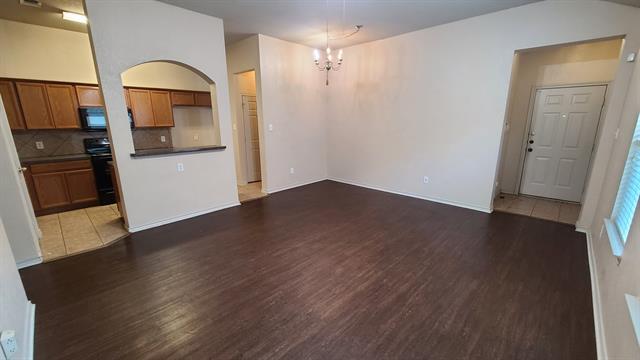 Charming home with neutral paint and wood laminate flooring in the living areas! Features include 10-ft ceilings, stylish fixtures, and a bright, open layout. The kitchen offers custom tile counters and backsplash, trendy black appliances, built-in microwave, and a breakfast bar that opens to the living space perfect for everyday living or entertaining with a fenced backyard. Located in the desirable Mistletoe Hill neighborhood where you have access to a 6-acre park with 3 acres of open play fields, exercise stations, pavilion, picnic areas, playground, and scenic walking trails. Conveniently situated less than a mile from shopping and dining with quick access to I-35W for an easy commute. Information deemed reliable but not guaranteed. Agents and tenants to verify schools and measurements.
