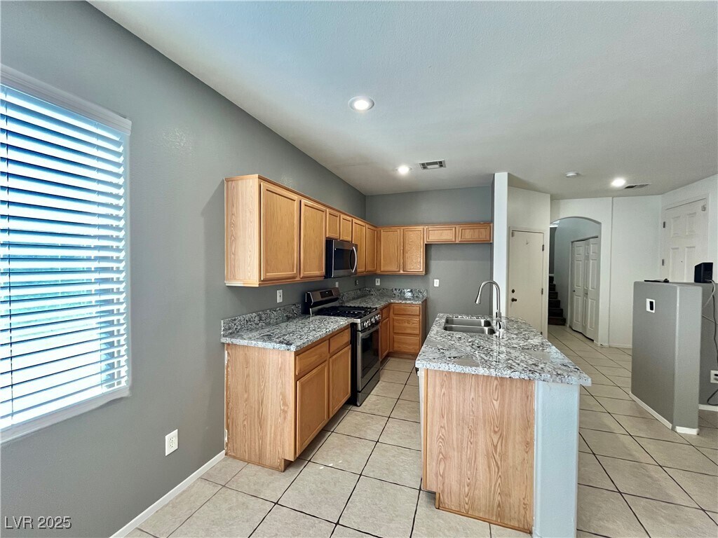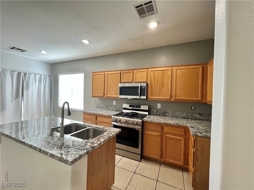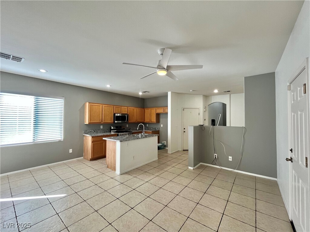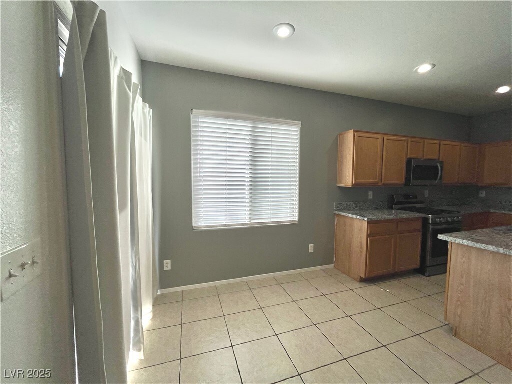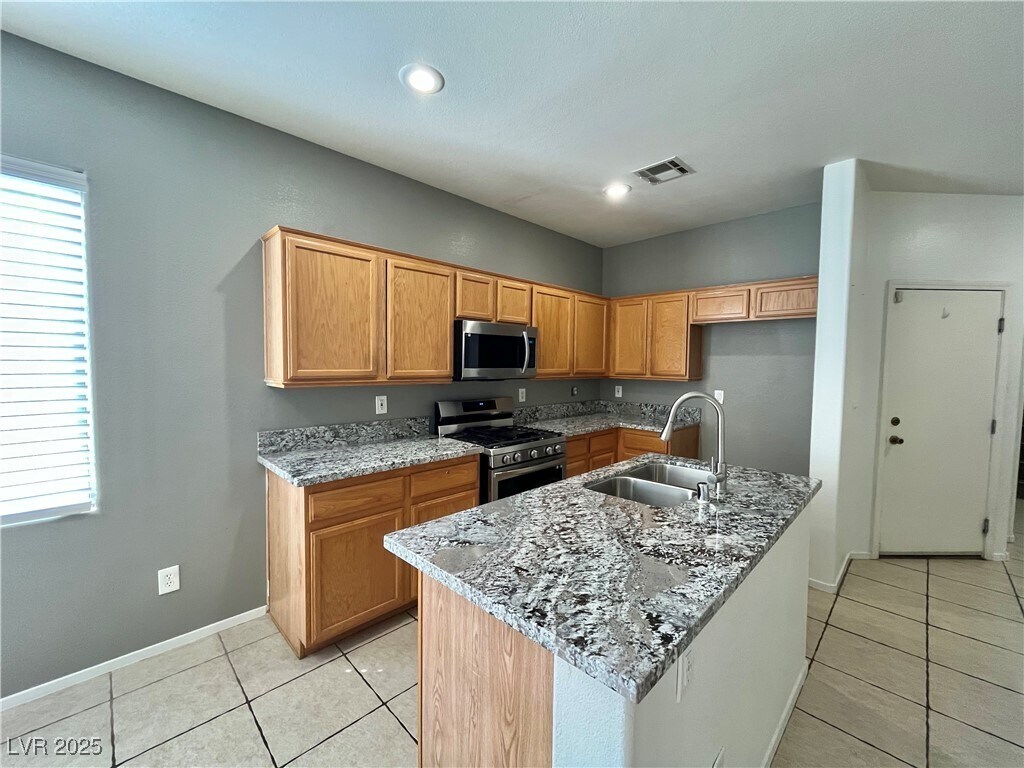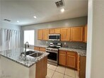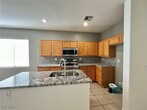 See this charming 3 bedroom, 2 bath cozy southwest home! 1187 sq ft, 3 bedroom, 2 bath + Unique split 2 car garage! Open and bright ktichen area with island and breakfast bar, granite countertops, oak cabinets, tile floors, recessed lighting, SS appliances, dining nook and pantry that is perfect for entertaining! Primary bedroom with ceiling fan & light, luxury vinyl plank floors and walk in closet. Primary bath with cultured marble counters, oak cabinets and tub/shower combo. Bed 2 & 3 with ceiling fan & light, luxury vinyl plank floors and mirrored closet doors. Laundry down. Patio doors lead to easy maintenance backyard with concrete slab patio with covered patio and desert landscaping. Close to shops, restaurants, and 215 freeway access. 15 minutes to the Las Vegas Strip, and 10 Minutes to the airport! See this one today!